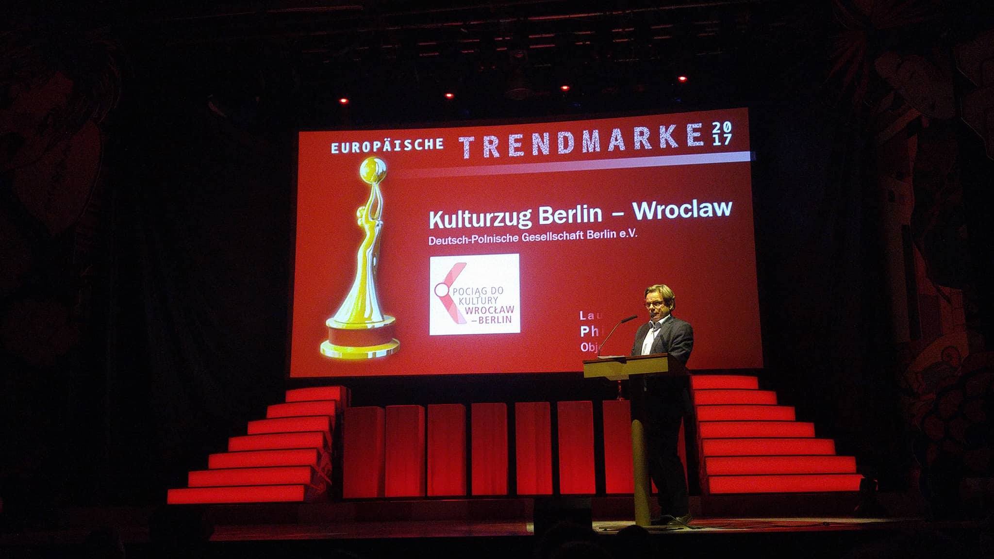 Pociąg do Kultury Berlin-Wrocław z jedynym w swoim rodzaju programem kulturalnym został uhonorowany nagrodą Europejskiej Marki Kultury. Podczas wczorajszego rozdania nagród w berlińskim Wintergarten Pociąg do Kultury otrzymał europejską nagrodę w kategorii „Trend 2017”.