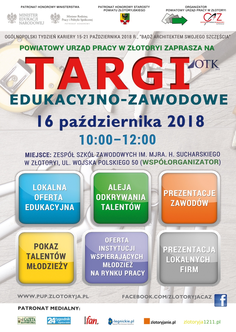 Patronat nad X Ogólnopolskim Tygodniem Kariery objęło Ministerstwo Edukacji Narodowej oraz Ministerstwo Rodziny, Pracy i Polityki Społecznej. W Złotoryi jednym z patronów medialnych jest również portal regionfan.pl.