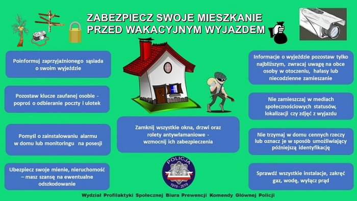 W okresie wakacyjnych wyjazdów trzeba zrobić wszystko, aby do minimum ograniczyć włamania do domów i kradzież naszej własności z mieszkań. Policjanci przypominają kilka podstawowych zasad, o których musimy pamiętać zanim udamy się na urlop.