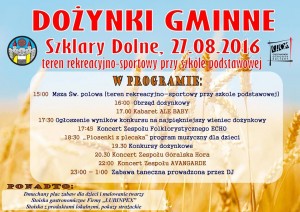 W sobotę 27 sierpnia dożynki odbywać się będą w Szklarach Dolnych. Zabawa potrwa od godziny 15:00 do 1:00 w nocy. Przygotowano m. in. występ kabaretu Ale Baby, koncert zespołu Avangarde i program muzyczny dla dzieci ,,Piosenki z plecaka”. W niedzielę zaś na dożynkowych zabawach będą bawić się mieszkańcy Grębocic, Gaworzyc oraz Jakubowa Lubińskiego.