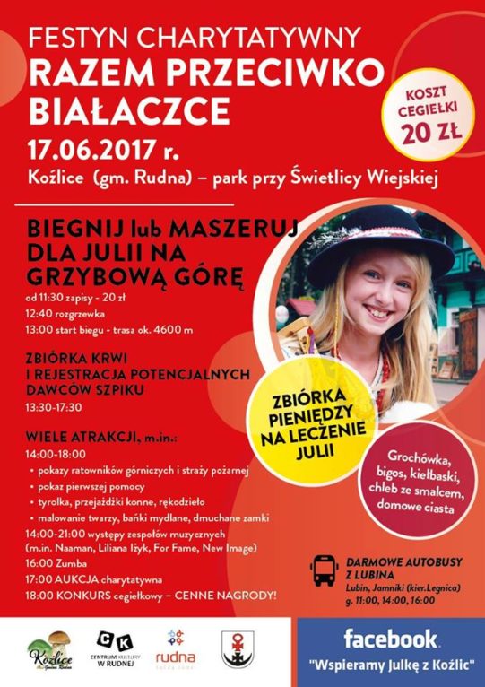 Póki co, potrzebne będą pieniądze na dalsze leczenie Julki. Dlatego tak ważne jest, by jak najwięcej osób przyjechało na festyn do Koźlic. – Nie potrzebujemy ludzi z wypchanymi portfelami. Wystarczy, żeby każdy kupił symboliczną cegiełkę za 20 zł. Grosz do grosza i będziemy mogli pomóc, a także przekazać rodzinie siłę i energię do walki z chorobą – zachęca Aleksandra Kurek.