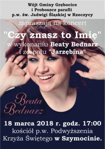 Beata Bednarz i zespół „Jarzębina” wystąpią w koncercie „Czy znasz to Imię” w kościele p.w. Podwyższenia Krzyża Świętego w Szymocinie, gmina Grębocice.