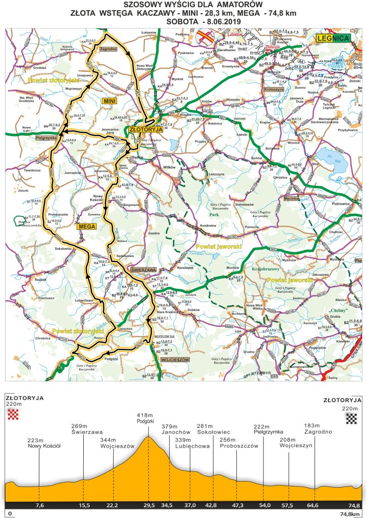 Szosowy wyścig dla amatorów liczy 74,8 km na trasie MEGA oraz 28,3 km na trasie MINI. Start wyścigu zaplanowany jest ze złotoryjskiego rynku o godzinie 16:00 i prowadzić będzie przez Nowy Kościół, Sędziszową, Świerzawę, Wojcieszów, Podgórki, Janochów, Lubiechową, Sokołowiec, Proboszczów, Pielgrzymkę, Wojcieszyn, Zagrodno i Złotoryję. W wymienionych miejscowościach należy się spodziewać utrudnień w ruchu do godz. ok. 19.30. Ulica Środkowa w Sędziszowej będzie w tym czasie całkowicie zamknięta dla kierowców.