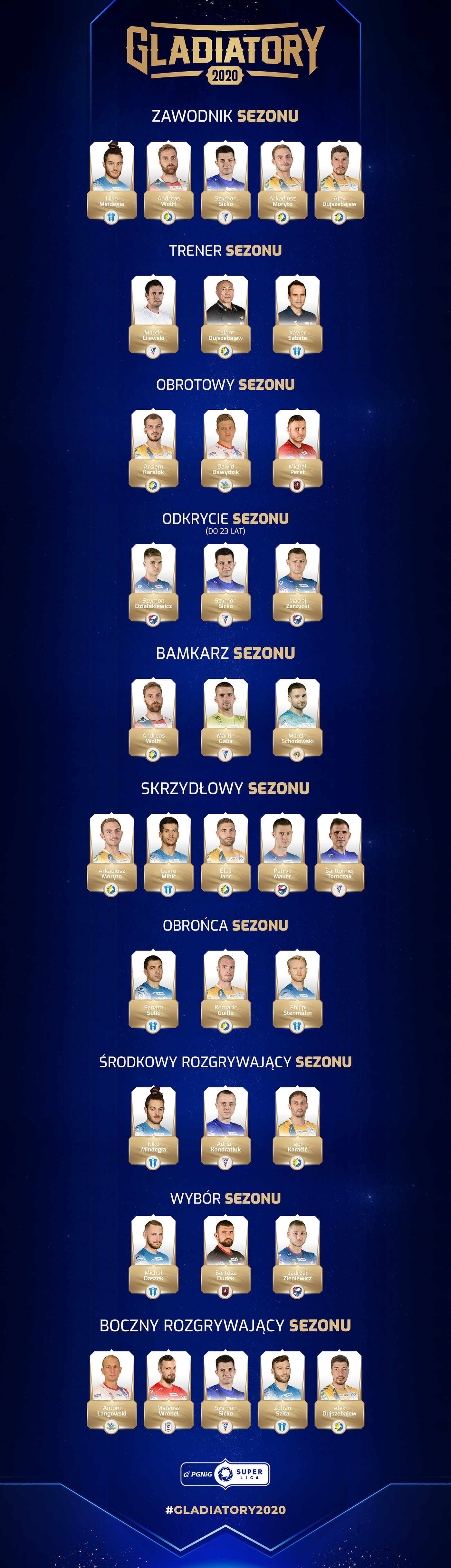 Mimo wcześniejszego zakończenia rozgrywek, organizatorzy postanowili docenić wysiłek zawodników, którzy rozegrali 169 meczów, czyli praktycznie całą rundę zasadniczą i przyznać prestiżowe tytuły Gladiatorów sezonu 2019/2020.
