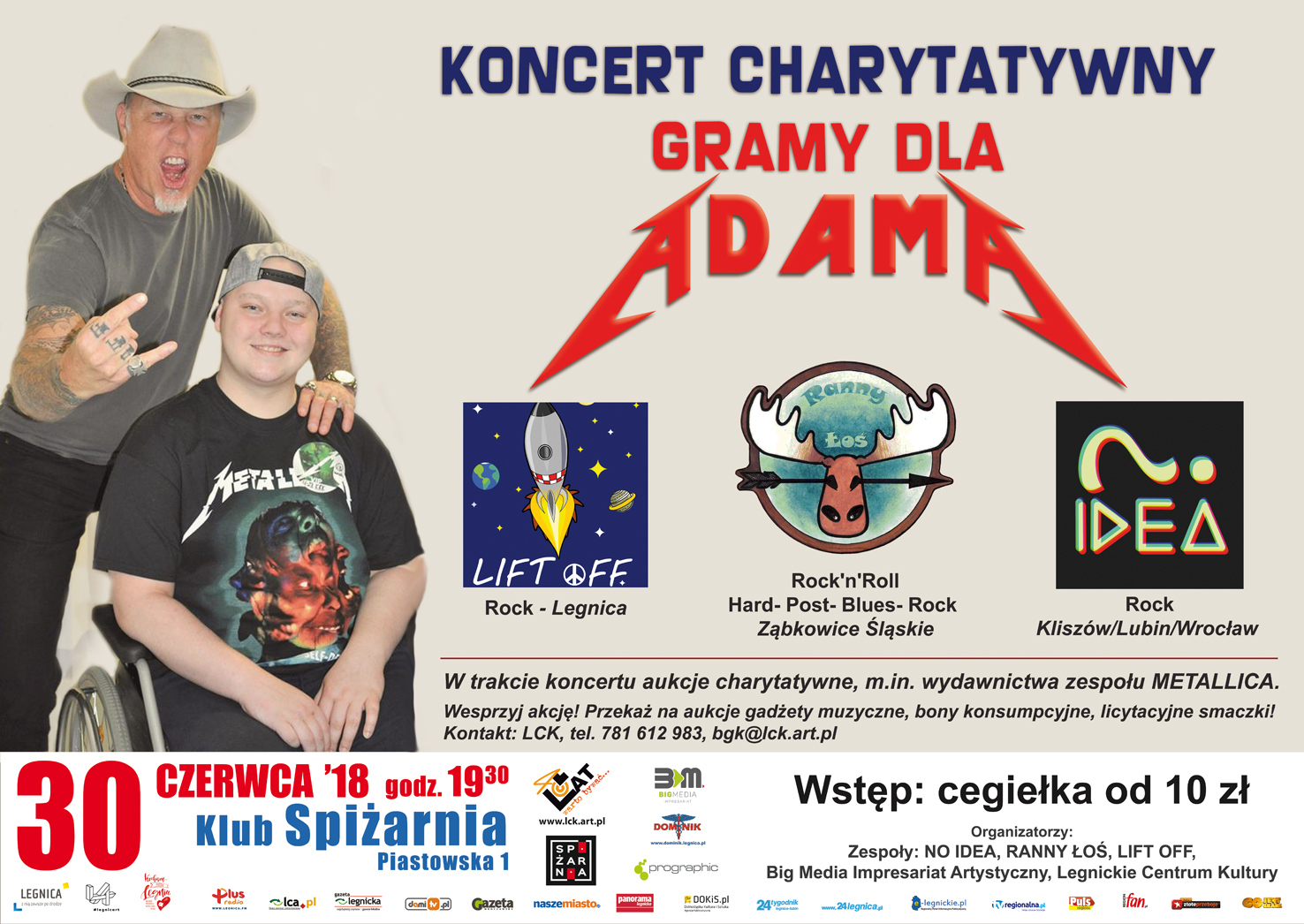 Szczęście Adama polega na tym, że otacza go mnóstwo ludzi chętnych do pomocy. Przekonaliśmy się o tym choćby pod koniec maja, gdy lokalna grupa Biegam Pomagam zorganizowała charytatywny bieg. Teraz czas na kolejne wydarzenie, które ma przyczynić się do powrotu legnickiego gimnazjalisty do zdrowia. W najbliższą sobotę, 30 czerwca, w klubie Spiżarnia rozpocznie się koncert grup: No Idea, Ranny Łoś oraz Lift Off. Będzie też licytacja m.in. wydawnictw zespołu Metallica, którego Adam jest wielkim fanem. Goście koncertu będą mogli przekazać na aukcję własne gadżety, nie tylko muzyczne, a wcześniej – wykupić cegiełkę za co najmniej 10 zł. Cały dochód z imprezy trafi do Adama.