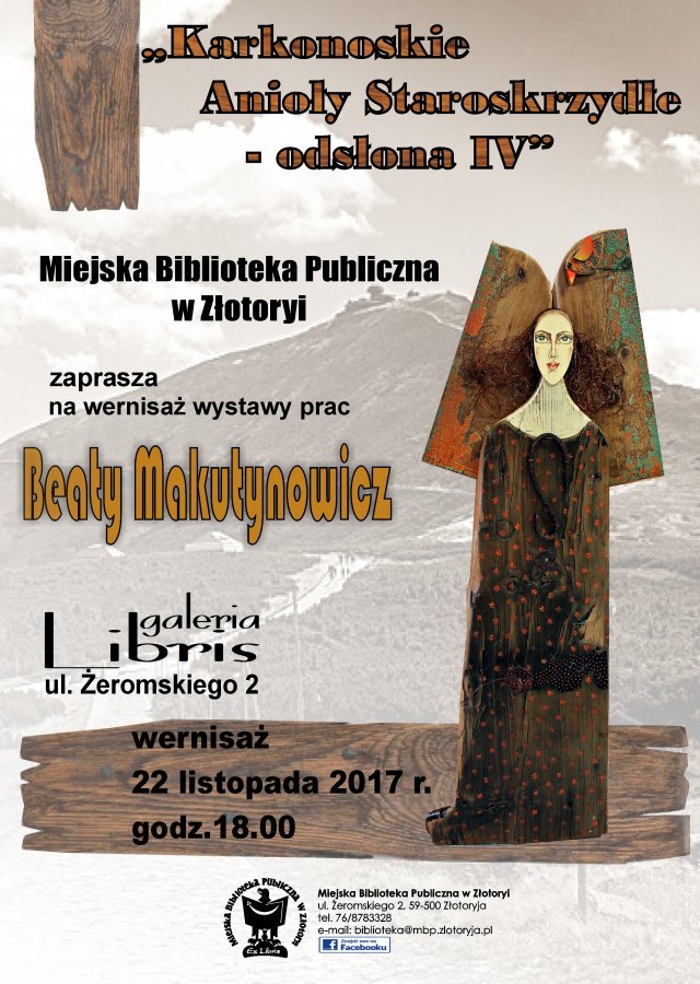 Miejska Biblioteka Publiczna w Złotoryi zaprasza w najbliższą środę na wernisaż wystawy prac Beaty Makutynowicz, czyli kolejną odsłonę Karkonoskich Aniołów Staroskrzydłych.