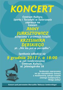 Już jutro w sali konferencyjnej Centrum Kultury, Sportu i Turystyki w Świerzawie wystąpi znana piosenkarka jazzowa i producentka muzyczna Anna Jurksztowicz. Koncert artystki będzie połączony z promocją książki Krzesimira Dębskiego „Nic nie jest w porządku”.