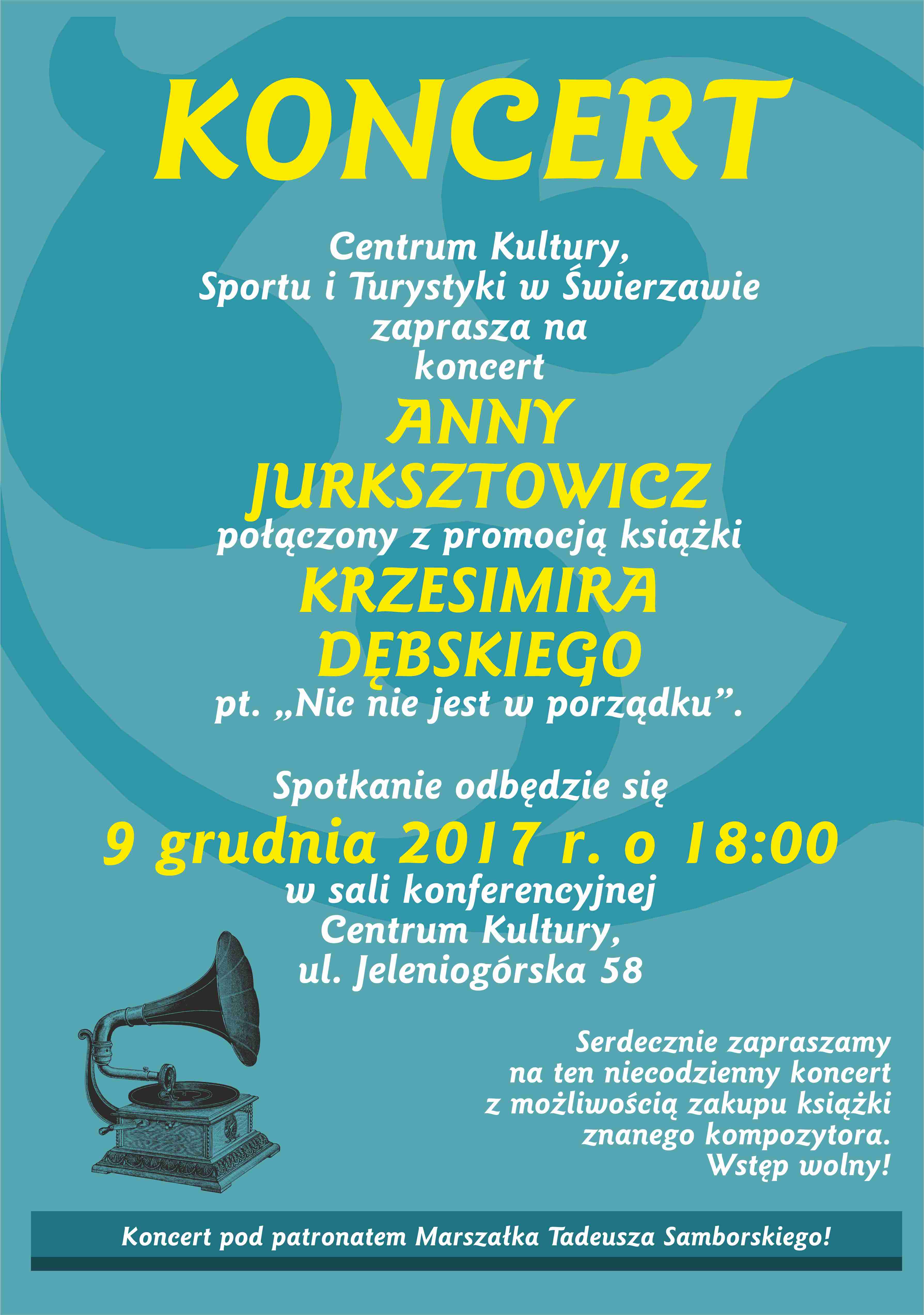 Początek koncertu zaplanowano na godz. 18. Odbędzie się on Centrum Kultury, Sportu i Turystyki w Świerzawie, przy ul. Jeleniogórskiej 58 i będzie połączony z promocją książki męża artystki Krzesimira Dębskiego pt. „Nic nie jest w porządku”. Wstęp na koncert jest bezpłatny.