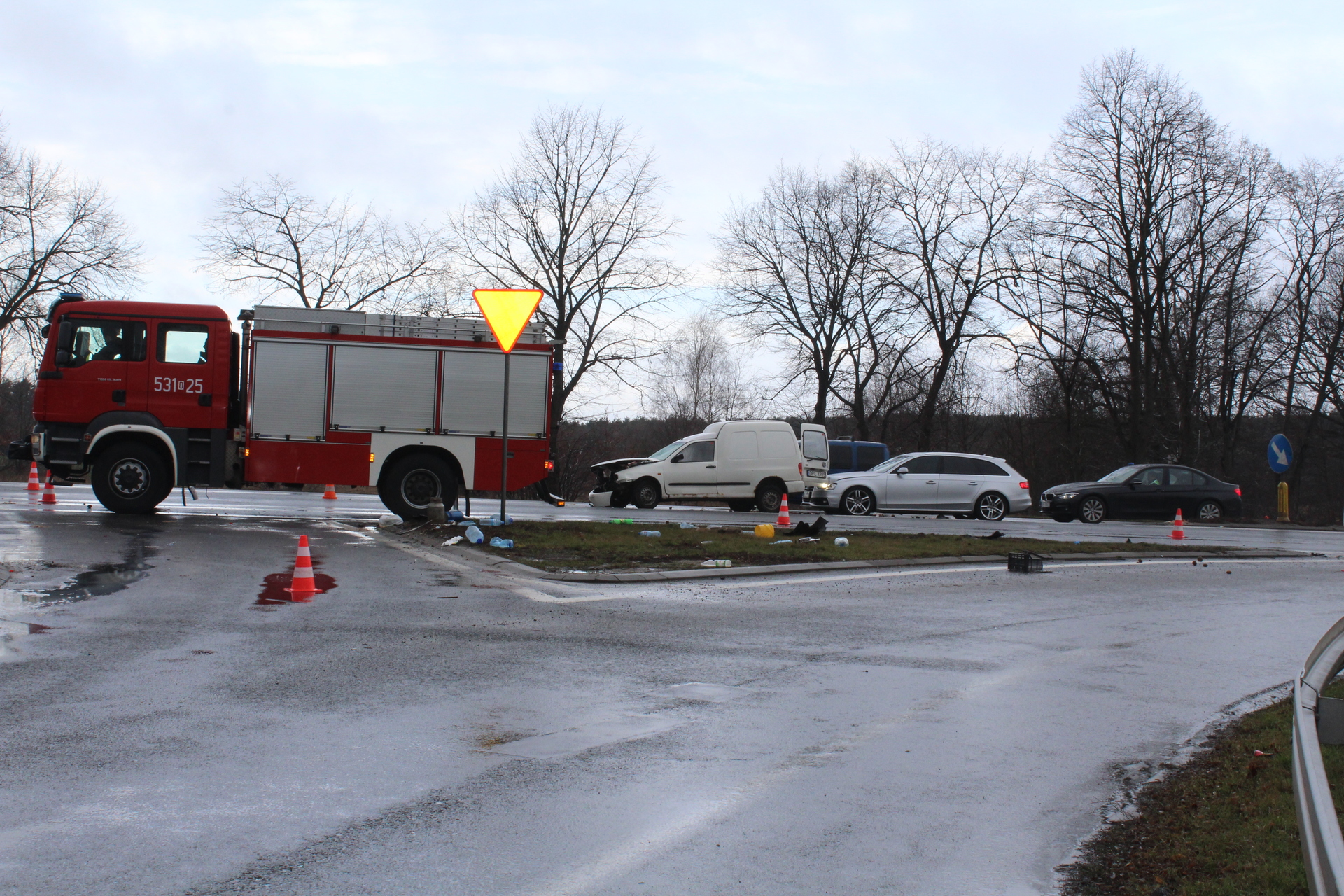 Dyżurny złotoryjskiej jednostki Powiatowej Straży Pożarnej pierwsze zgłoszenie odebrał tuż przed godz. 8. Kierowca osobowego forda jadący drogą wojewódzką nr 363 prawdopodobnie nie dostosował prędkości do warunków panujących na jezdni, w wyniku czego jego pojazd wpadł w poślizg i uderzył w przydrożny mur na ulicy Grunwaldzkiej.