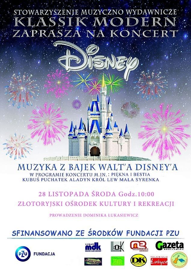W programie „Muzyka z bajek Walt’a Disney’a” młodzież będzie mogła usłyszeć najpopularniejsze piosenki z ulubionych bajek Disney’a, wraz z projekcją ich fragmentów na ekranie kinowym oraz fachowym prowadzeniem koncertu.