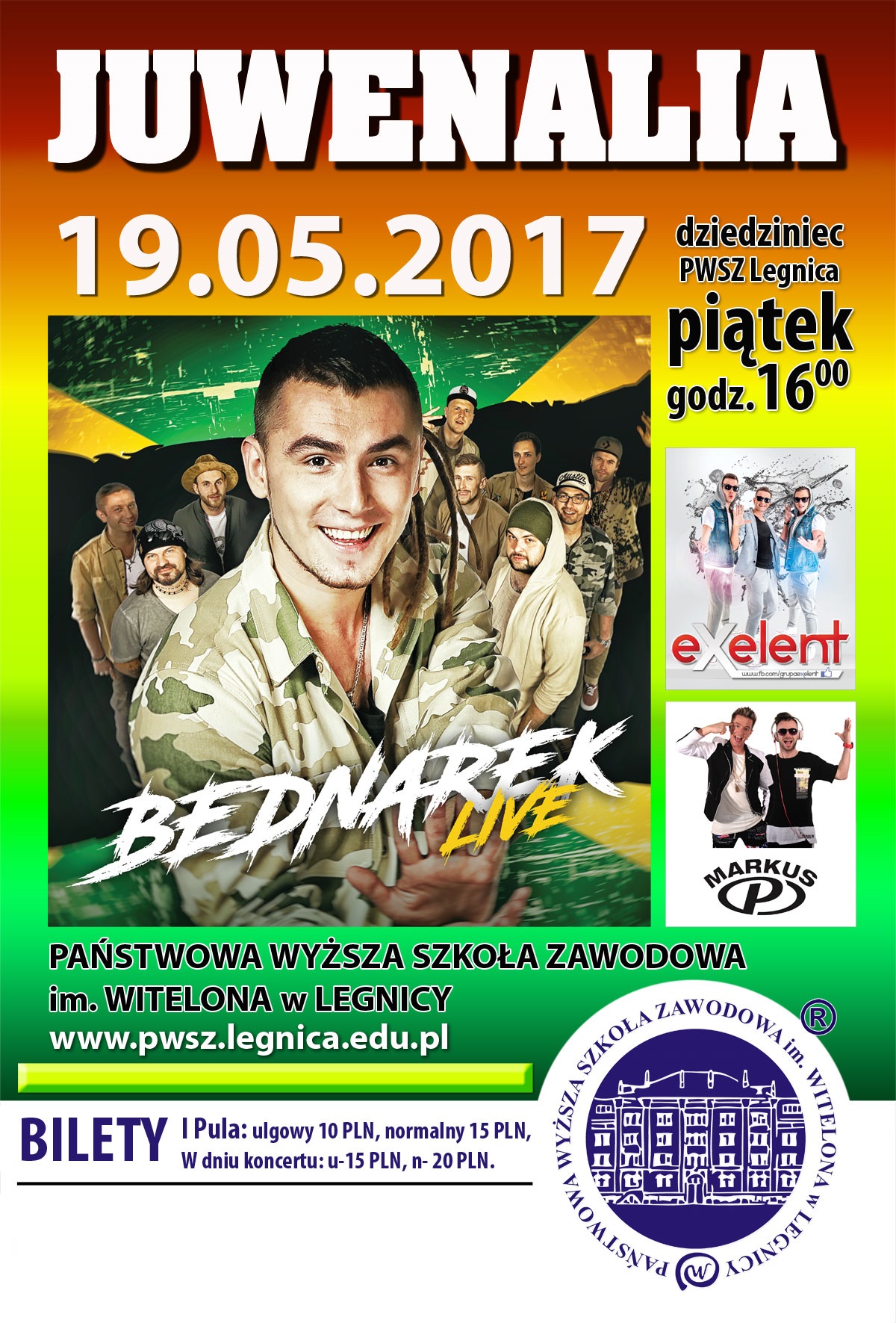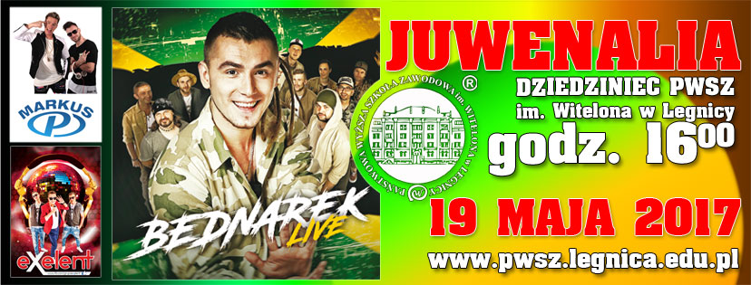 Najważniejszym dniem Juwenaliów 2017 w Legnicy będzie czwartek – 19 maja. W tym dniu na scenie w kampusie Państwowej Wyższej Szkoły Zawodowej im. Witelona w Legnicy zaprezentują się DJTomek, EXELENT i MARKUS P. Gwiazdą wieczoru będzie Kamil Bednarek, znany z takich hitów jak „Cisza” oraz „Talizman”.