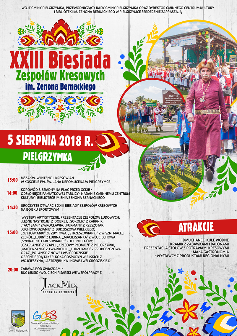 Tegoroczną biesiadę o godz. 13 rozpocznie msza święta w intencji kresowian w kościele pw. św. Jana Nepomucena. Po nabożeństwie nastąpi odsłonięcie pamiątkowej tablicy nadającej Gminnemu Centrum Kultury i Bibliotece w Pielgrzymce imię Zenona Bernackiego. Po nim korowód przejdzie na boisko miejscowego klubu sportowego Fenix. Tam odbędzie się uroczyste otwarcie XXIII Biesiady Zespołów Kresowych.