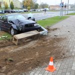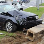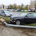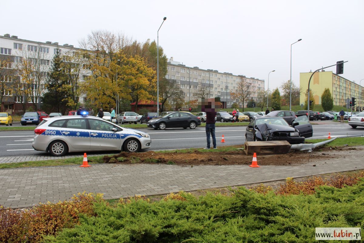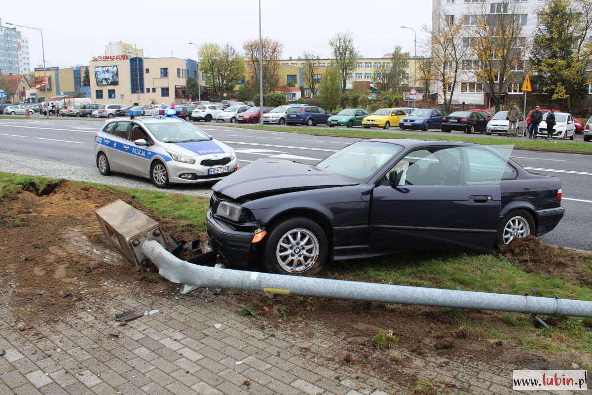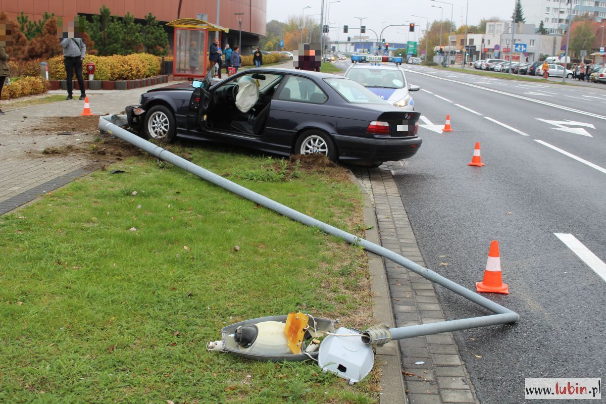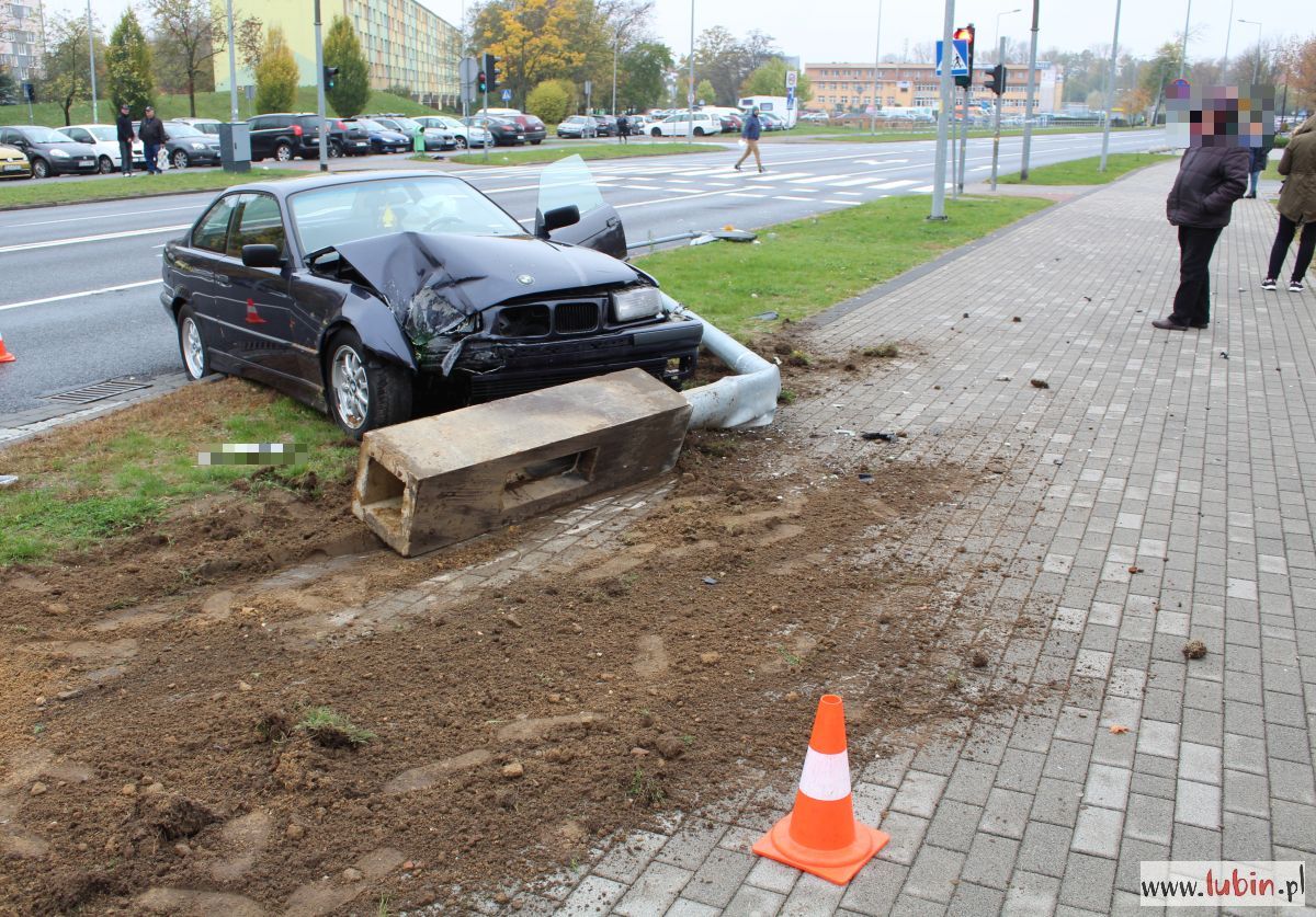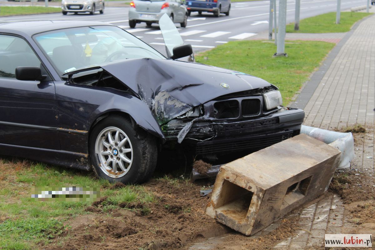 Wypadek wyglądał dosyć dramatycznie. Ciemne BMW wjechało w latarnię przy ulicy Sikorskiego w Lubinie. Siła uderzenia była tak duża, że wyrwała z ziemi słup wraz z jego podstawą.
