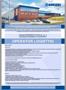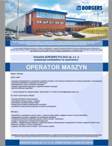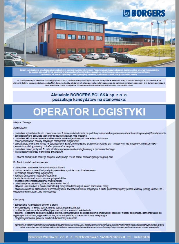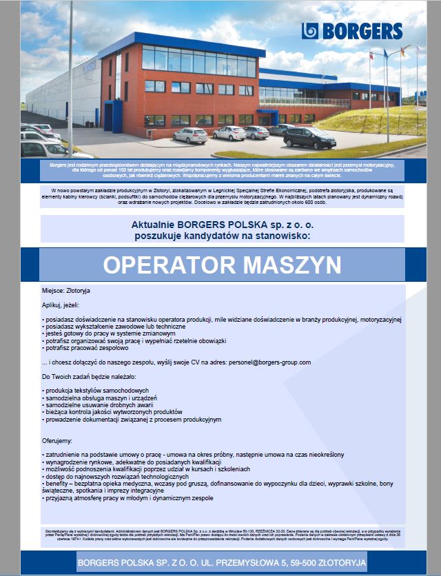 Operator maszyn, operator logistyki, logistyk utrzymania ruchu i elektromechanik – pracowników na te stanowiska poszukuje firma Borgers, która w ubiegłym roku rozpoczęła działalność na terenie Złotoryi. W miejscowym urzędzie pracy zaplanowano na jutro spotkanie dla kandydatów.