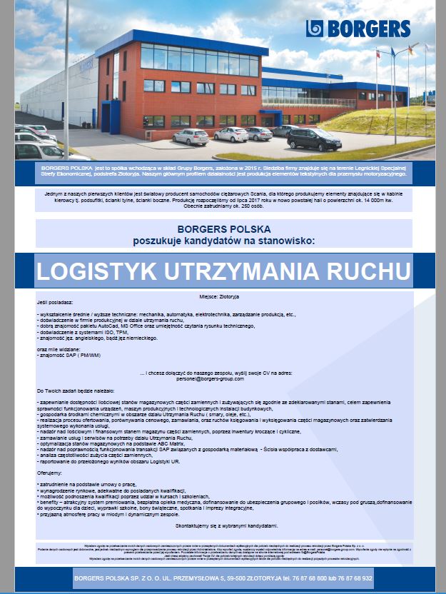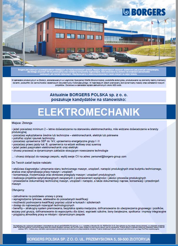 Borgers to rodzinne przedsiębiorstwo działające na międzynarodowych rynkach. Głównym obszarem działalności spółki jest przemysł motoryzacyjny, dla którego od ponad 150 lat produkuje oraz rozwija komponenty wygłuszające. W nowo powstałym zakładzie produkcyjnym w Złotoryi (znajdującym się na terenie Legnickiej Specjalnej Strefy Ekonomicznej) produkowane są elementy kabiny kierownicy (ścianki, podsufitki) do samochodów ciężarowych. Docelowo w zakładzie zatrudnionych ma zostać około 600 osób.
