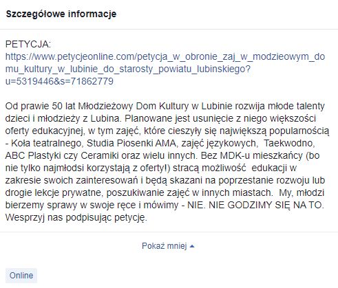 Kilka dni temu w mediach społecznościowych pojawiły się głosy mieszkańców i samych pracowników MDK protestujących przeciwko likwidacji placówki i podkreślających sukcesy jej wychowanków. Na Facebooku powstała grupa „Ratujmy MDK w Lubinie!”, gdzie znajduje się m.in. link do petycji w sprawie dalszej działalności ośrodka. Apel do starosty lubińskiego podpisało do tej pory 258 osób.