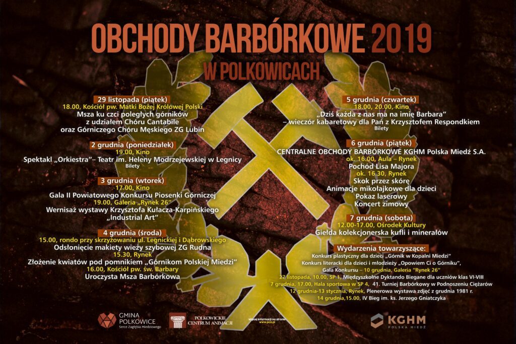 Główne obchody Barbórki rozpoczną się w piątek, 29 listopada. O godz. 18 w kościele Matki Bożej Królowej Polski odprawiona zostanie msza św. ku czci poległych górników, w której wezmą udział Chór Cantabile i Górniczy Chór Męski ZG „Lubin”. W poniedziałek, 2 grudnia, o godz. 19 w Kinie – spektakl pt. „Orkiestra” w wykonaniu Teatru im. Heleny Modrzejewskiej w Legnicy. Dzień później, 3 grudnia, – także w Kinie – Gala II Powiatowego Konkursu Piosenki Górniczej, a o godz. 19 w Galeriia „Rynek 26” – wernisaż wystawy Krzysztofa Kułacza-Karpińskiego „Industrial Art”.