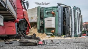 Jadący krajową „trójką” kierowca ciężarowego terberga podczas próby wyprzedzania zauważył, że z naprzeciwka jedzie inny samochód. Mężczyzna, chcąc uniknąć czołowego zderzenia, gwałtownie skręcił i zjechał na przydrożny parking stacji paliw. Tam jego pojazd uderzył w stojące ciężarowe volvo z naczepą, po czym się przewrócił.