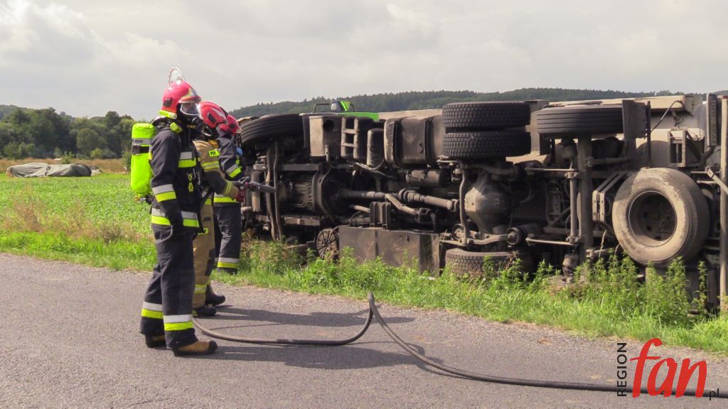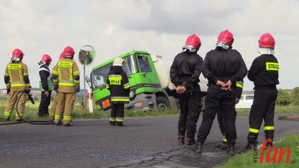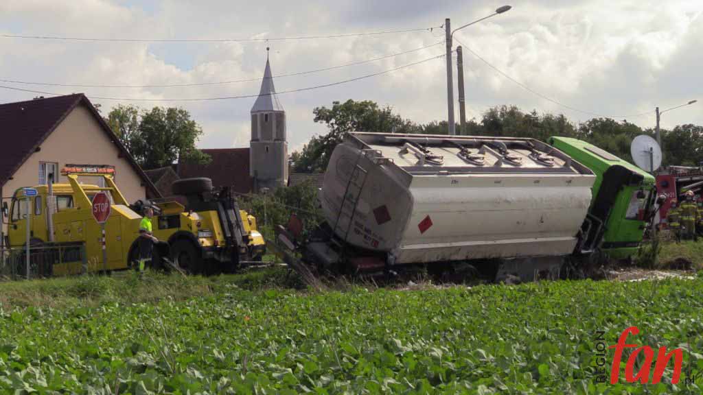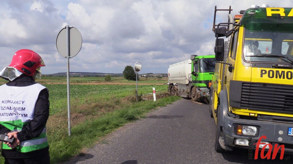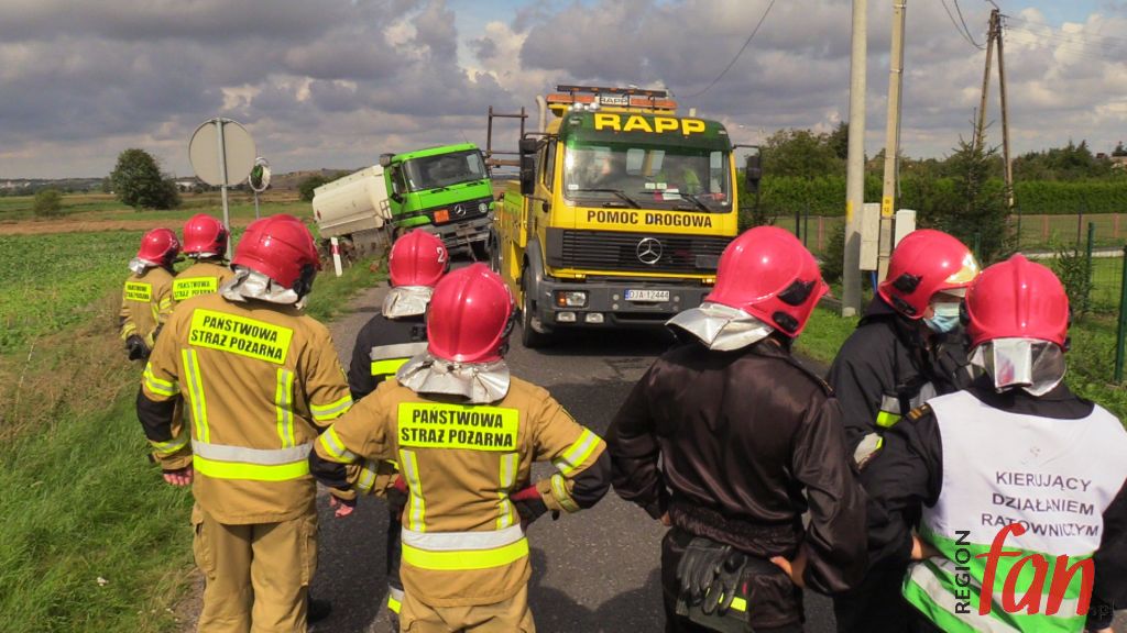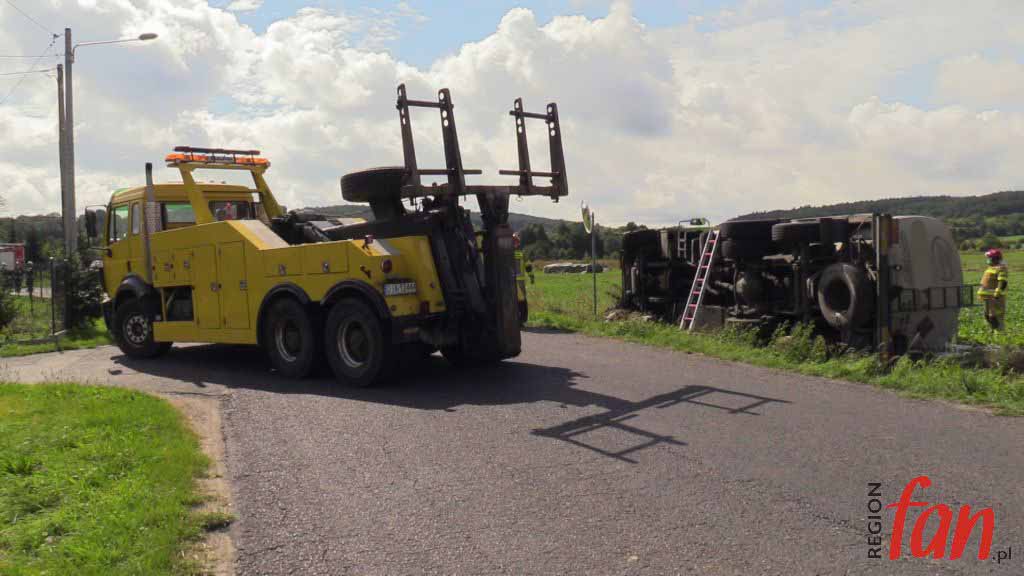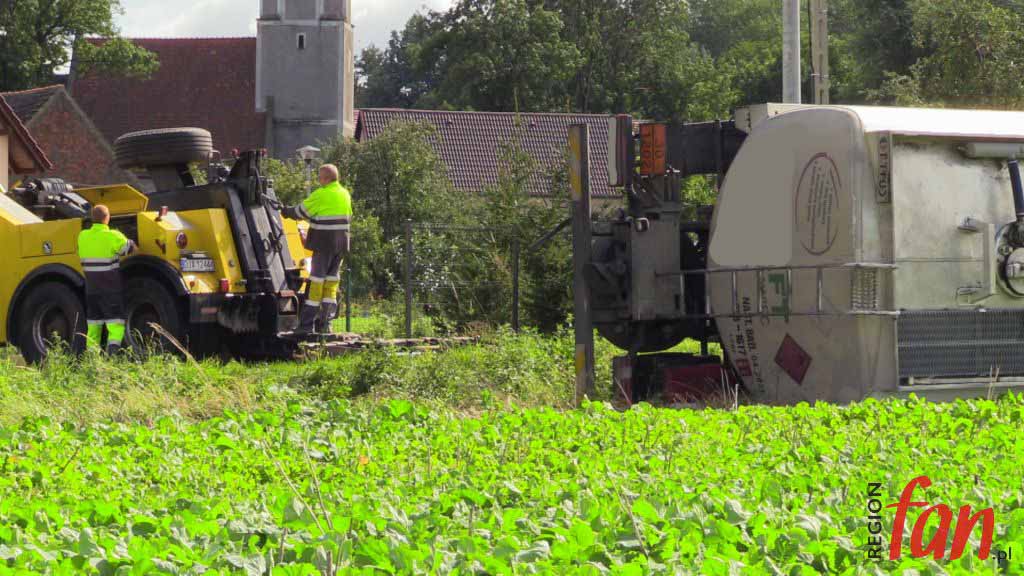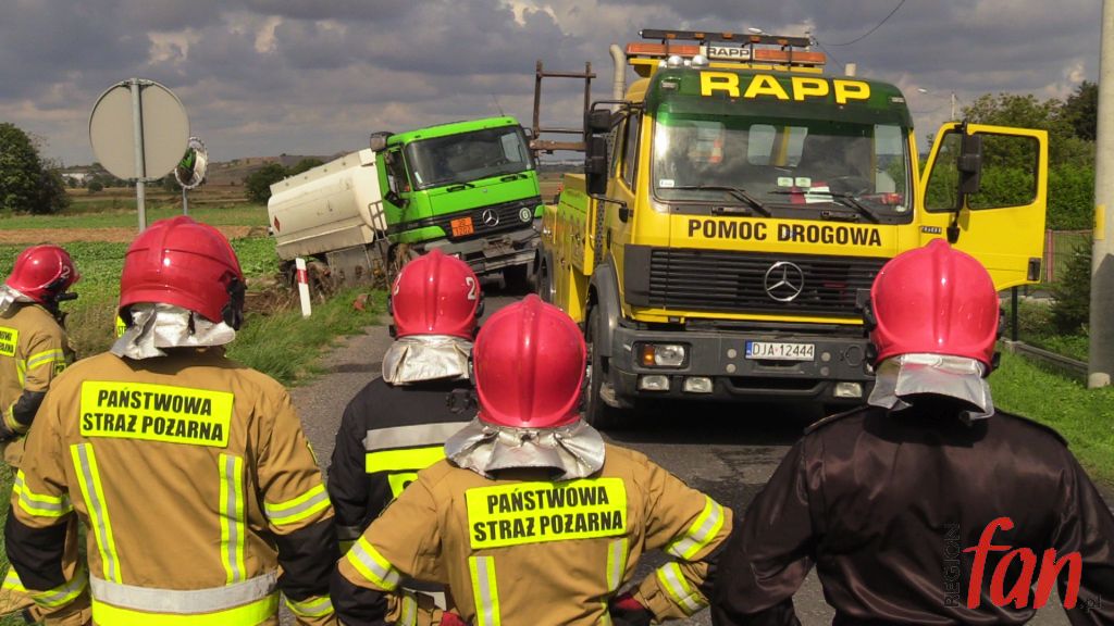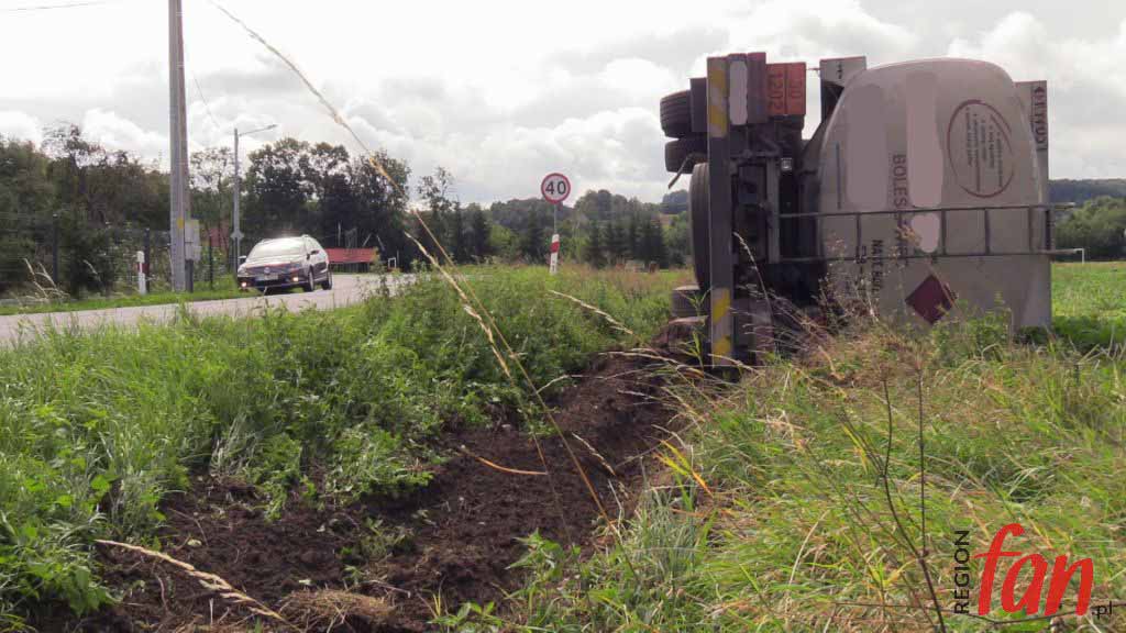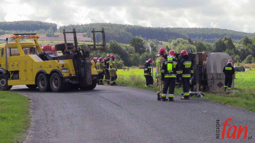 Do zdarzenia doszło po godz. 13. Zadysponowano służby ratownicze, medyczne i policję. Kierujący ciężarowym mercedesem nie potrzebował pomocy ZRM. Z uwagi na zagrożenie wyciekiem paliwa na miejsce wezwano też specjalistyczne służby chemiczne z Wałbrzycha. Strażacy zabezpieczyli drobny przeciek ze zbiornika paliwa mercedesa. Po szczegółowych oględzinach cysterny ciężkim sprzętem podjęto próby postawienia składu na koła. Akcję udało się przeprowadzić sprawnie i szybko. Droga była zablokowana w obu kierunkach na 90 minut. Właściciel firmy z Bolesławca wysłał na miejsce zastępczą cysternę, do której przepompowano 6 tys. l oleju napędowego. Obecni na miejscu funkcjonariusze ustalili, że 60-letni kierowca nie zachował należytej ostrożności podczas jazdy, jechał zbyt blisko prawego pobocza i pojazd stoczył się do rowu na łuku drogi. Sprawcę zdarzenia ukarano mandatem karnym.