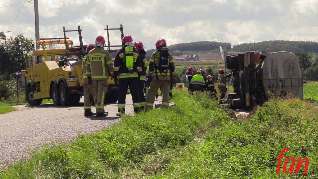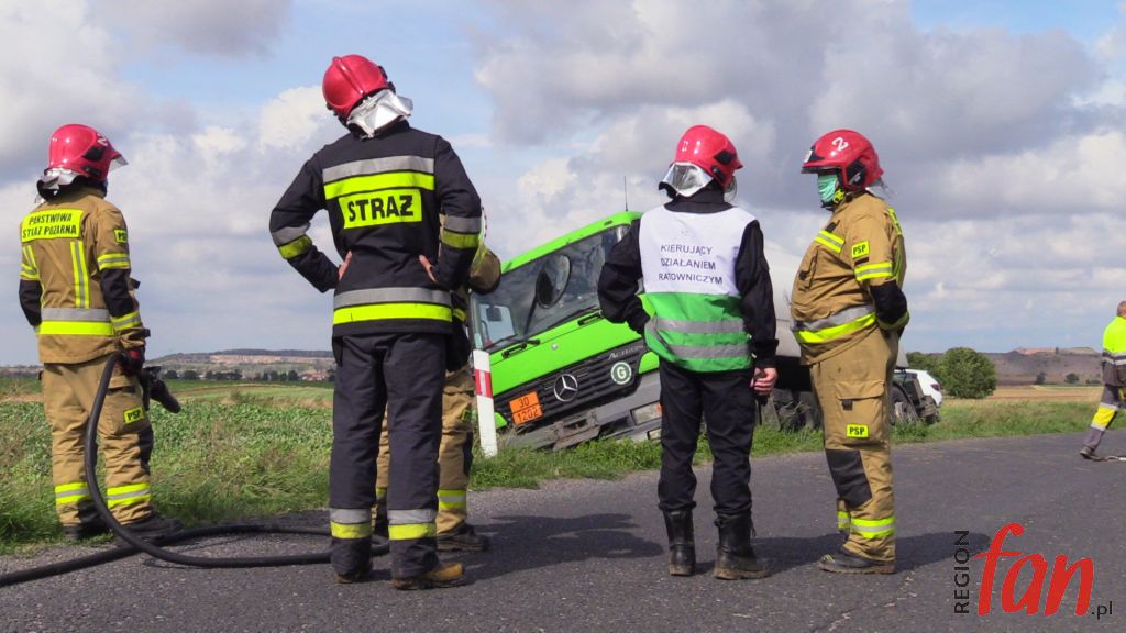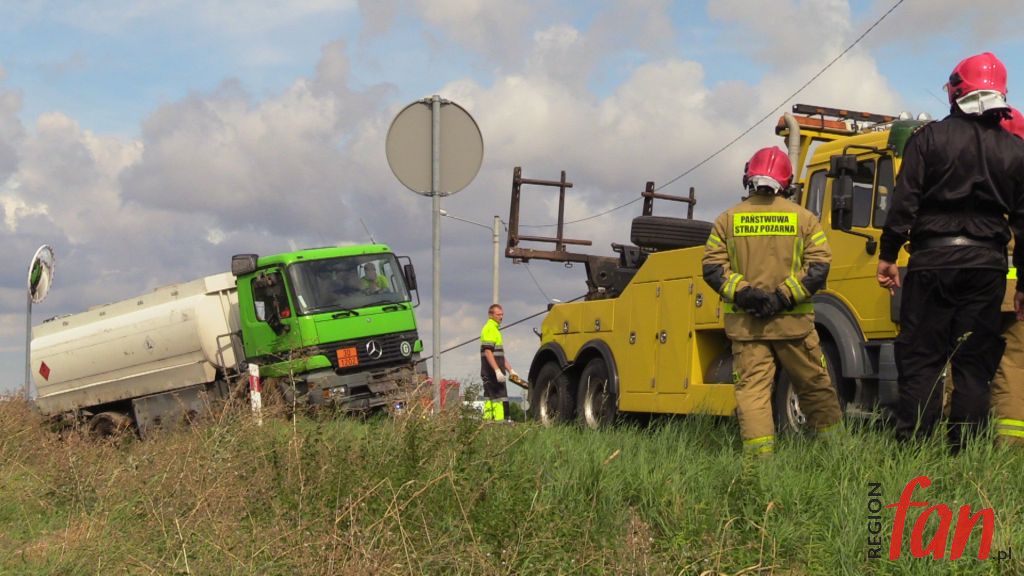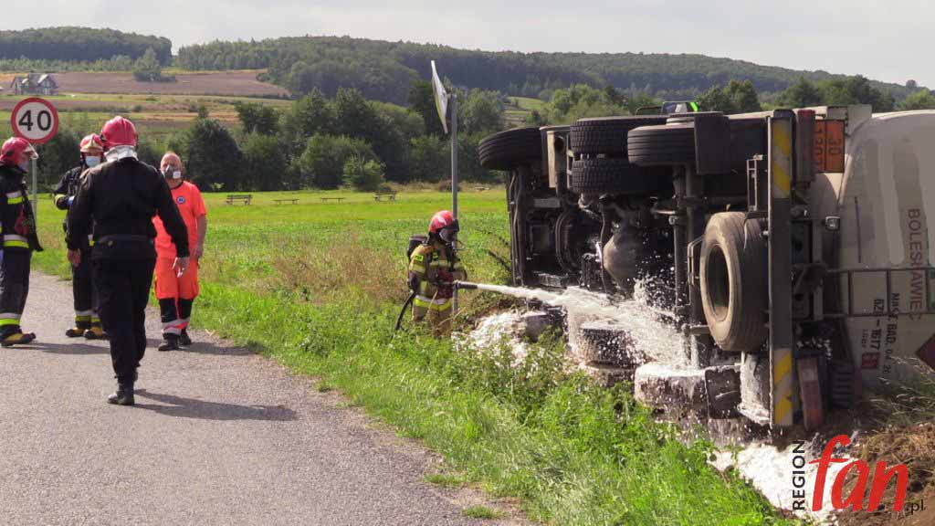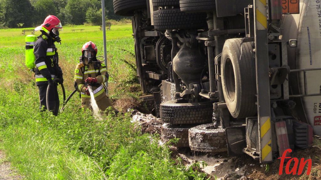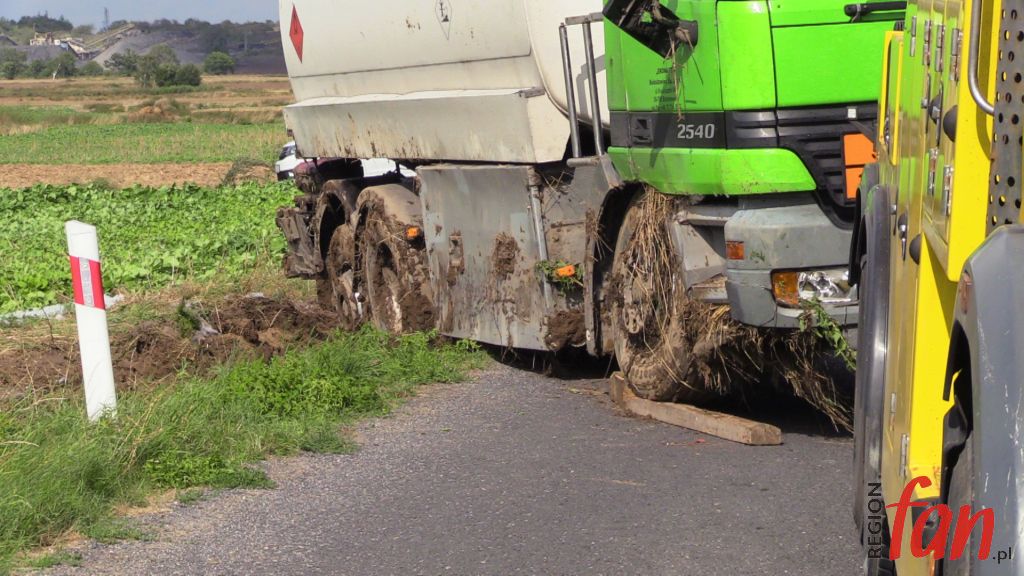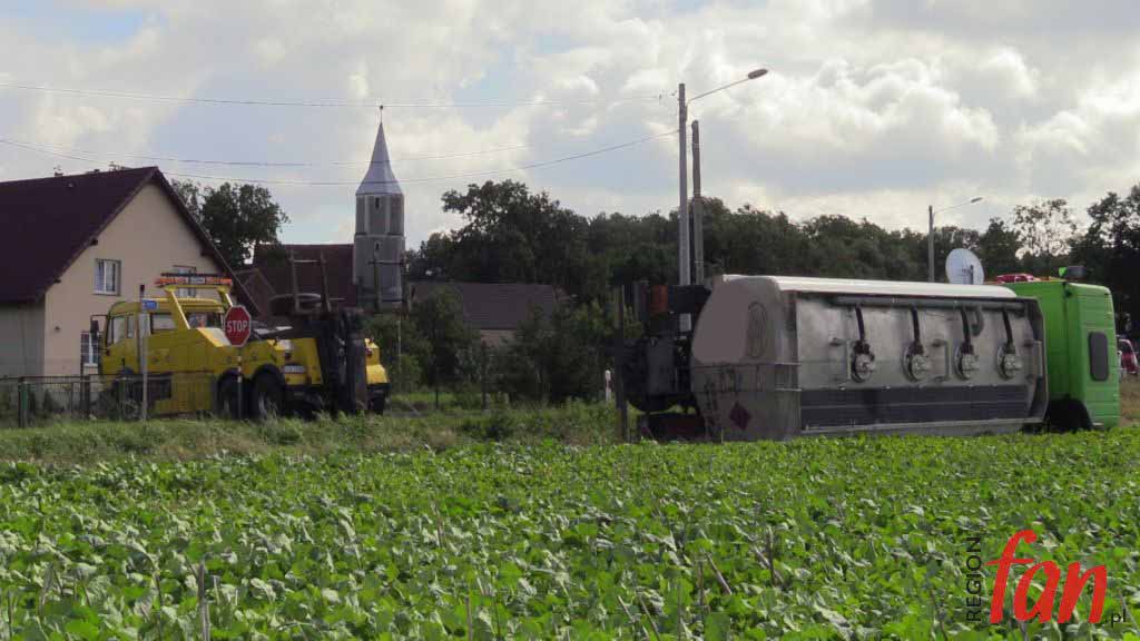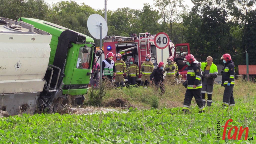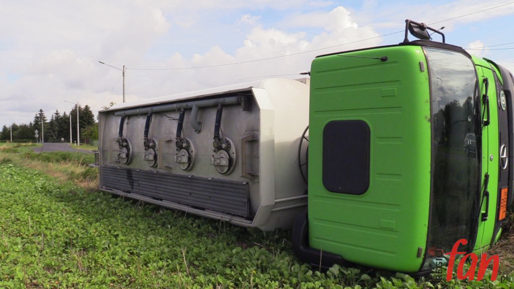 Do zdarzenia doszło po godz. 13. Zadysponowano służby ratownicze, medyczne i policję. Kierujący ciężarowym mercedesem nie potrzebował pomocy ZRM. Z uwagi na zagrożenie wyciekiem paliwa na miejsce wezwano też specjalistyczne służby chemiczne z Wałbrzycha. Strażacy zabezpieczyli drobny przeciek ze zbiornika paliwa mercedesa. Po szczegółowych oględzinach cysterny ciężkim sprzętem podjęto próby postawienia składu na koła. Akcję udało się przeprowadzić sprawnie i szybko. Droga była zablokowana w obu kierunkach na 90 minut. Właściciel firmy z Bolesławca wysłał na miejsce zastępczą cysternę, do której przepompowano 6 tys. l oleju napędowego. Obecni na miejscu funkcjonariusze ustalili, że 60-letni kierowca nie zachował należytej ostrożności podczas jazdy, jechał zbyt blisko prawego pobocza i pojazd stoczył się do rowu na łuku drogi. Sprawcę zdarzenia ukarano mandatem karnym.