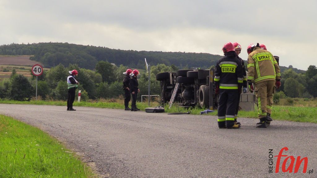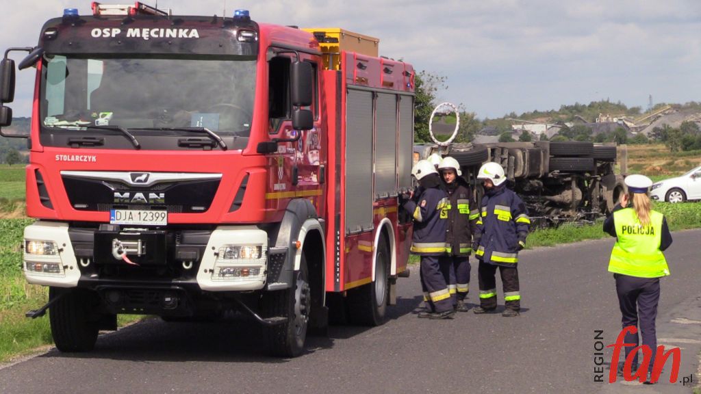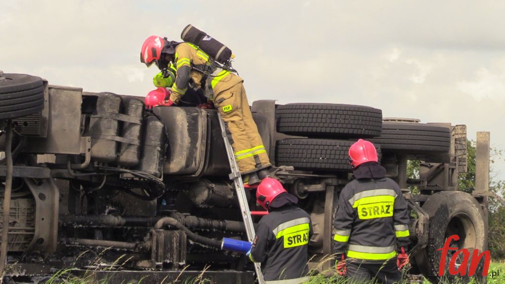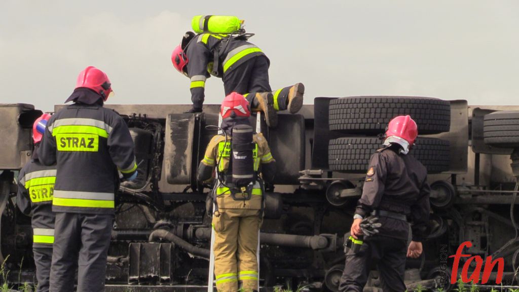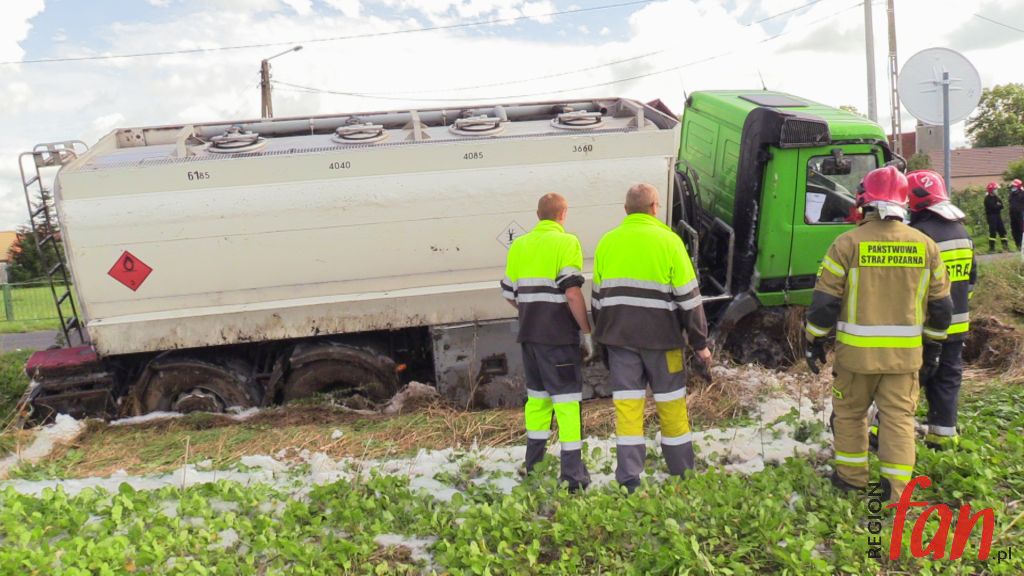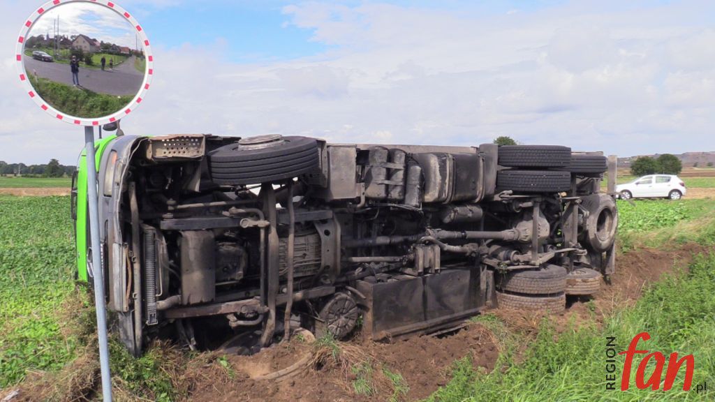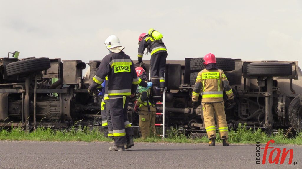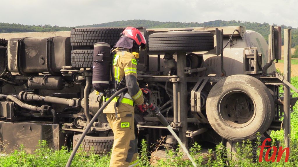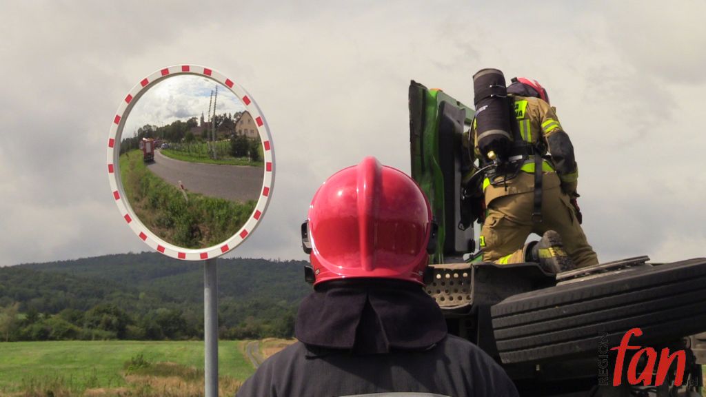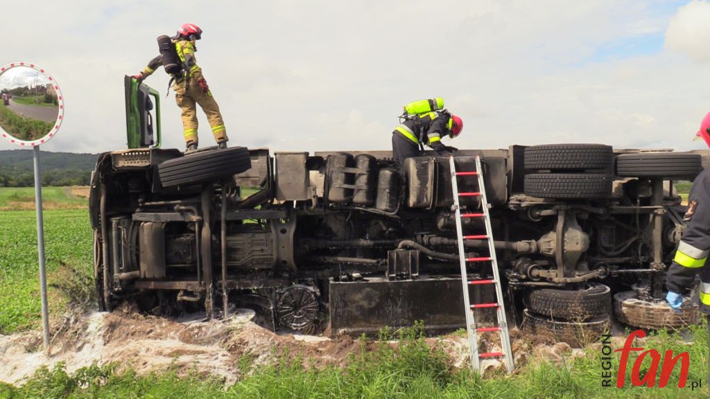 Do zdarzenia doszło po godz. 13. Zadysponowano służby ratownicze, medyczne i policję. Kierujący ciężarowym mercedesem nie potrzebował pomocy ZRM. Z uwagi na zagrożenie wyciekiem paliwa na miejsce wezwano też specjalistyczne służby chemiczne z Wałbrzycha. Strażacy zabezpieczyli drobny przeciek ze zbiornika paliwa mercedesa. Po szczegółowych oględzinach cysterny ciężkim sprzętem podjęto próby postawienia składu na koła. Akcję udało się przeprowadzić sprawnie i szybko. Droga była zablokowana w obu kierunkach na 90 minut. Właściciel firmy z Bolesławca wysłał na miejsce zastępczą cysternę, do której przepompowano 6 tys. l oleju napędowego. Obecni na miejscu funkcjonariusze ustalili, że 60-letni kierowca nie zachował należytej ostrożności podczas jazdy, jechał zbyt blisko prawego pobocza i pojazd stoczył się do rowu na łuku drogi. Sprawcę zdarzenia ukarano mandatem karnym.