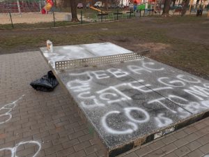 W tym tygodniu na terenie kompleksu przy ul. Oświęcimskiej wandale pomalowali farbą stół do ping ponga oraz chodniki. Pojawiły się tam wulgarne napisy i rysunki. Przypomnijmy, że teren został zagospodarowany w ramach projektu Legnickiego Budżetu Obywatelskiego. To dzięki inicjatywie mieszkańców powstał tam plac zabaw z siłownią oraz największą piramidą linową w mieście, a pobliskie boisko doczekało się nowej nawierzchni. Dopóki przy tamtejszym kompleksie i podobnych do niego miejscach nie pojawią się kamery, straty będą najpewniej rosnąć, ku utrapieniu maluchów i ich opiekunów.