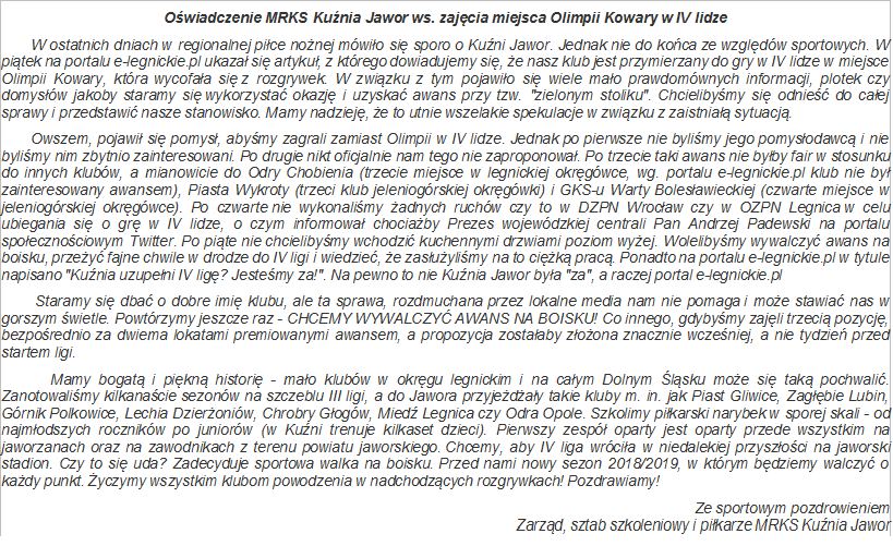 Co ciekawe „dogrywkę” w tej sprawie mieliśmy także w weekend, gdy jaworski klub wydał specjalne oświadczenie, w którym Kuźnia odcięła się od tego pomysłu i zaprzeczyła jakobyłaby zainteresowana takim rozwiązaniem.