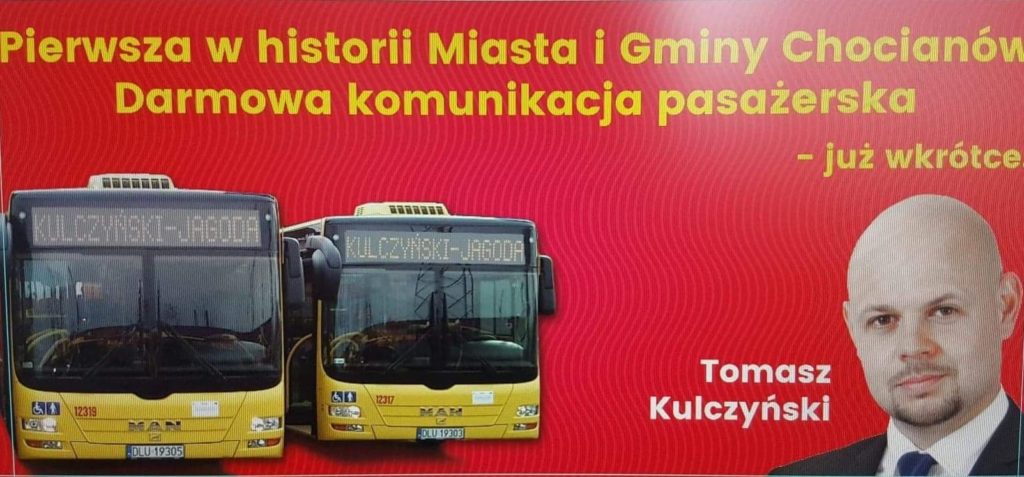 Tego jeszcze w Chocianowie nie było! W najbliższy weekend przed mieszkańcami tradycyjne Dni Jagody, na które bezpłatnie dowiozą ich autobusy przygotowane przez Tomasza Kulczyńskiego. – Uważam, że Miasto i Gmina Chocianów nie powinny odstawać od sąsiednich gmin w kwestii przewozów mieszkańców. Przy dobrym gospodarowaniu darmowa komunikacja nie jest żadnym znaczącym kosztem, co pokazała Ścinawa. – mówi Tomasz Kulczyński, pomysłodawca bezpłatnych autobusów na Dni Jagody.