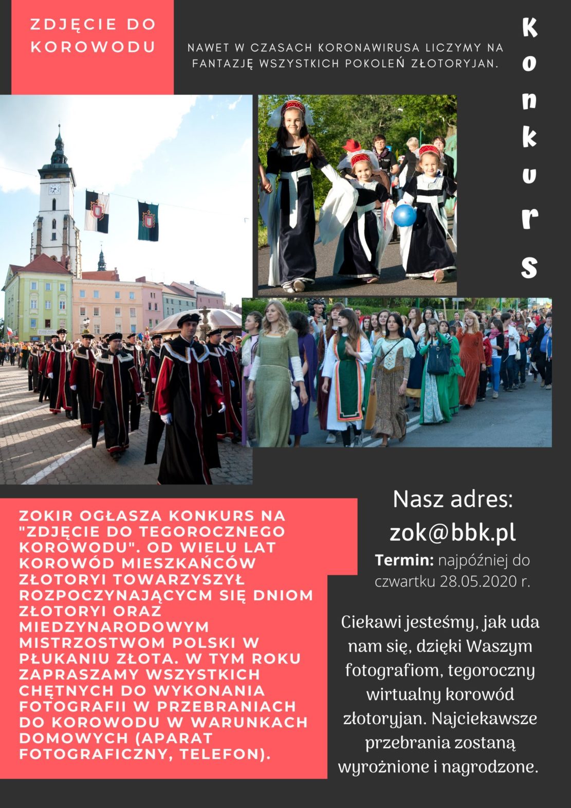 Gdyby nie koronawirus to już w najbliższy piątek jak co roku ulicami Złotoryi przeszedłby barwny korowód, rozpoczynający trzydniowe święto miasta oraz Międzynarodowe Mistrzostwa polski w Płukaniu Złota. Jak już wiemy, ze względu na stan epidemii, w tym roku imprezy te nie dojdą do skutku. Nie oznacza to jednak, że zabraknie wspomnianego korowodu, który tym razem przybierze wyjątkową, bo wirtualną, formę.