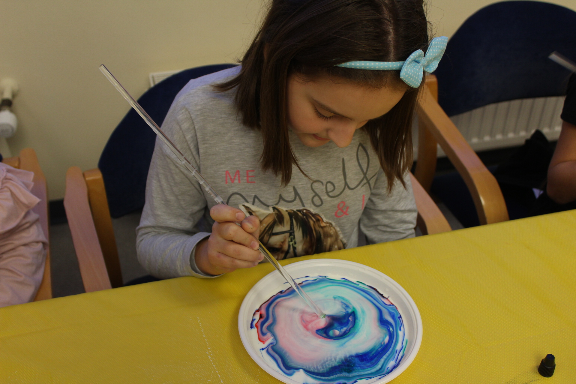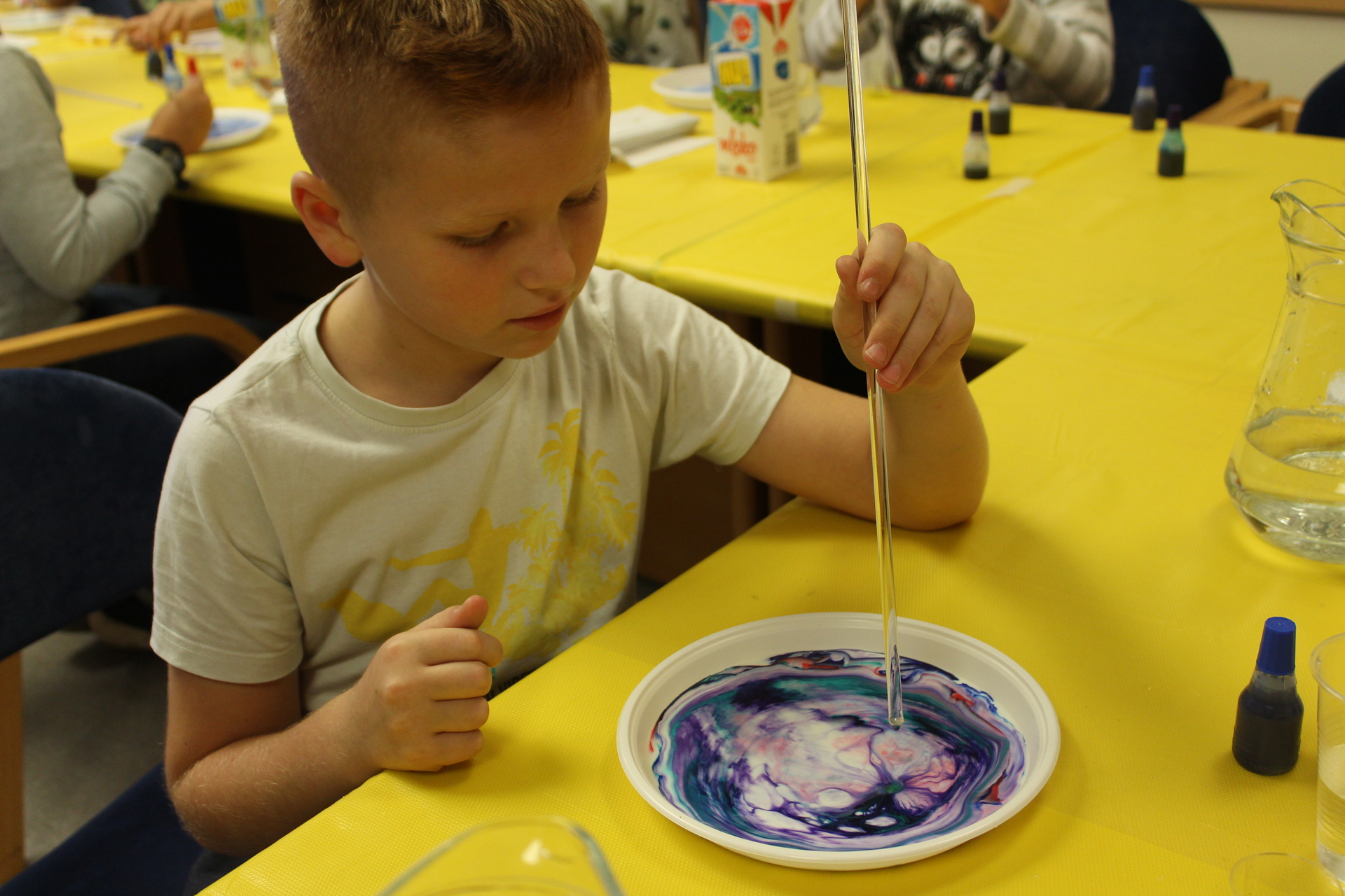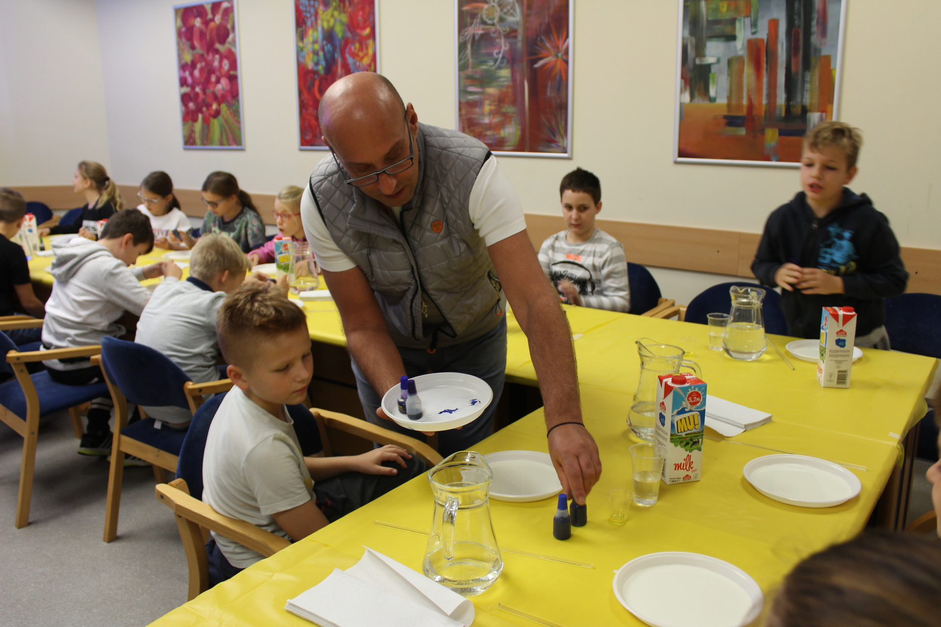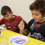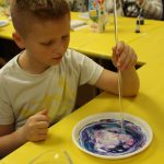 Zajęcia zaspokoją ambicję i młodszych, i starszych. Każdy znajdzie coś dla siebie. U pana Dariusza dzieci z pomocą mleka, atramentu i detergentu mogły wyczarować prawdziwe dzieła sztuki. Poznały też ciekawe doświadczenia z brokatem.