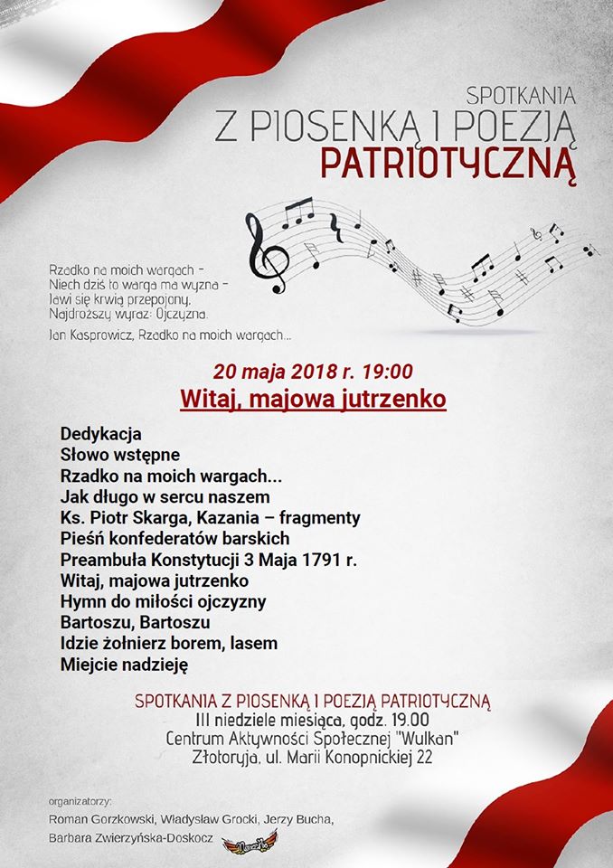 „Witaj, majowa jutrzenko”– tak zatytułowany jest pierwszy koncert piosenki i poezji patriotycznej, który już dziś o godz. 19:00 rozpocznie się w Centrum Aktywności Społecznej „Wulkan”. Złotoryjskie stowarzyszenie Nasze Rio zaprasza na podobne spotkania w każdą trzecią niedzielę miesiąca. Wstęp jest bezpłatny dla każdego.
