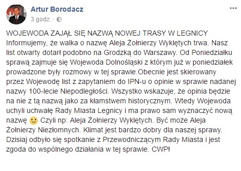 Dziennikarze posiłkowali się wpisem na FB lidera legnickiej Endecji Artura Borodacza. Oto jego treść w oryginale: „Od poniedziałku sprawą zajmuje się Wojewoda Dolnośląski z którym już w poniedziałek prowadzone były rozmowy w tej sprawie.Obecnie jest skierowany przez Wojewodę list z zapytaniem do IPN-u o opinie w sprawie nadanej nazwy 100-lecie Niepodległości. Wszystko wskazuje, że opinia będzie na nie z tą nazwą jako za kłamstwem historycznym. Wtedy Wojewoda uchyli uchwałę Rady Miasta Legnicy i ma prawo sam wyznaczyć nową nazwę. Czyli np: Aleja Żołnierzy Wyklętych. Być może Aleja Żołnierzy Niezłomnych. Klimat jest bardzo dobry dla naszej sprawy. Dzisiaj odbyło się spotkanie z Przewodniczącym Rady Miasta i jest zgoda do wspólnego działania w tej sprawie”.