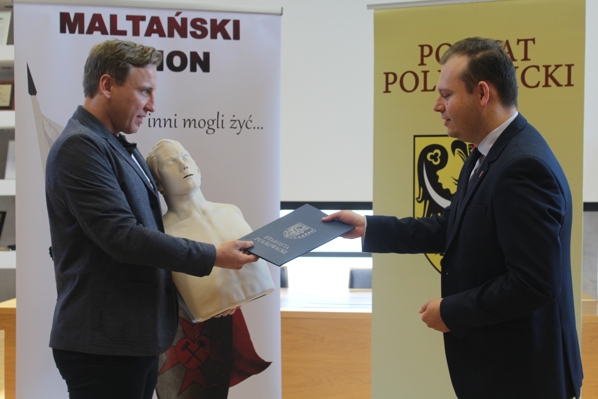Kilka tygodni temu wolontariusze Stowarzyszenia HDK PCK Maltański Legion bezpłatnie przeszkolili pracowników polkowickiego starostwa powiatowego w zakresie udzielania pierwszej pomocy. Dziś władze powiatu podziękowały za to przekazując stowarzyszeniu fantom do wykonywania ćwiczeń z resuscytacji krążeniowo-oddechowej.