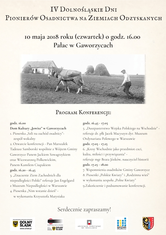 Spotkanie odbędzie się w czwartek, 10 maja, w gaworzyckim pałacu. W programie m.in. wykład Jana Engelgarda z Muzeum Niepodległości w Warszawie na temat znaczenia Ziem Zachodnich dla niepodległości Polski. Dr płk Jacek Macyszyn, dyrektor Muzeum Ordynariatu Polowego w Warszawie, mówić będzie o duszpasterstwie Wojska Polskiego na Wschodzie. Swoimi wspomnieniami podzielą się też osadnicy z gminy Gaworzyce.