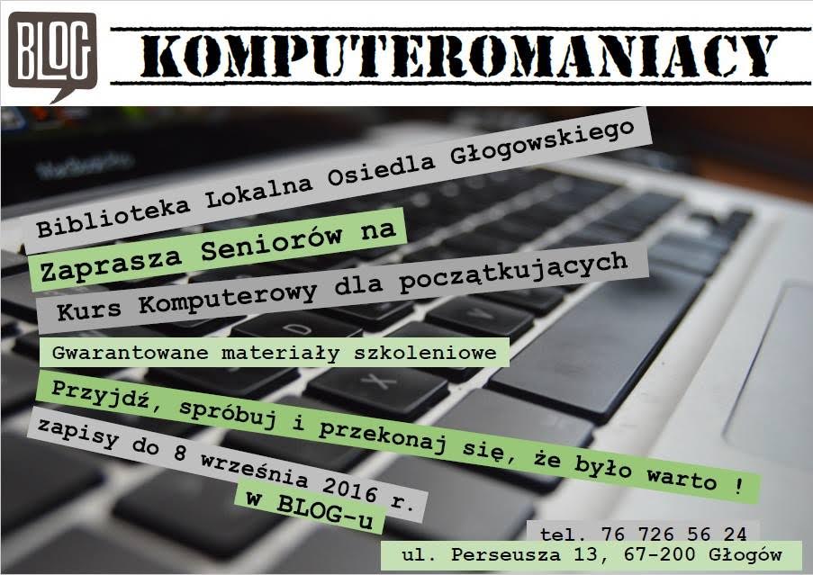 Biblioteka lokalna osiedla głogowskiego organizuje kolejny kurs komputerowy dla seniorów. Skierowany jest do osób, które chcą poznać podstawową obsługę komputera. Kurs jest bezpłatny, nabór trwa do 8 września 2016 roku.