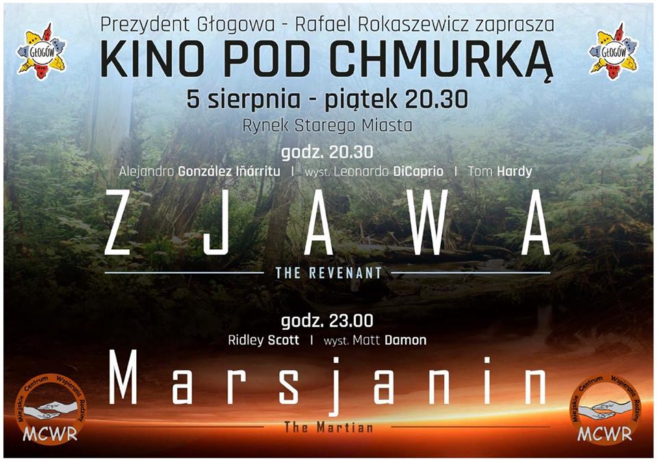 KINODwa filmy: „Zjawa” oraz „Marsjanin” można będzie obejrzeć w piątek, 5 sierpnia, w kinie pod chmurką – na głogowskim Rynku. Wstęp wolny.
