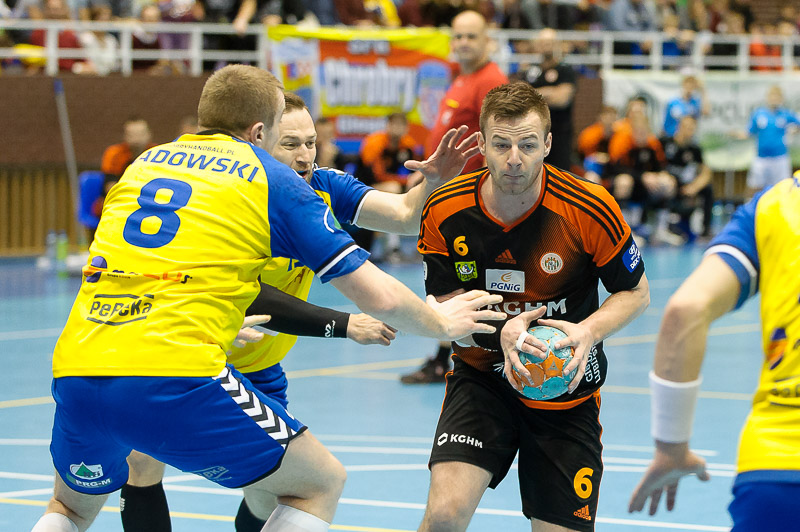 Spotkanie świetnie rozpoczął Chrobry, a konkretnie Marek Świtała, który w trzech pierwszych rzutach trzykrotnie wpisał się na listę strzelców. W międzyczasie premierowe trafienie na lubinian zaliczył również skrzydłowy Łukasz Kużdeba i po 6. min. gry ukazywał się wynik 3:1. Dwubramkowe prowadzenie z początku spotkania, jak się potem okazało, było najwyższym dystansem, który tego dnia udało się gospodarzom zbudować nad rywalami. Szybko do remisu doprowadzili Miedziowi i to właśnie owy rezultat lub jednobramkowe prowadzenie, które przechodziło z „rąk do rąk” w kolejnych minutach najwięcej razy można było ujrzeć na tablicy świetlnej. Dopiero na 120 sekund przed zejściem do szatni Wojciech Gumiński skutecznie egzekwując rzut karny zaliczył trafienie na 10:8 dla przyjezdnych. Przed syreną kończącą pierwszą część zmagań również z linii siedmiu metrów bramkarza gości pokonał kapitan Chrobrego i obie siódemki zeszły do szatni przy wyniku 9:10.