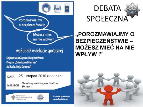 – Debata poświęcona będzie problematyce bezpieczeństwa na terenie miasta i powiatu głogowskiego oraz funkcjonowaniu aplikacji Krajowej Mapy Zagrożeń Bezpieczeństwa i aplikacji Moja Komenda – informuje Bogdan Kaleta, oficer prasowy KPP Głogów. – Zapraszamy do dyskusji o problemach nurtujących mieszkańców oraz propozycjach wspólnych działań dotyczących, między innymi: zachowań utrudniających życie mieszkańców, niszczenia mienia, utrudnień drogowych czy kradzieży. Zapraszamy do dyskusji nad inicjatywami rozwiązań lokalnych problemów.