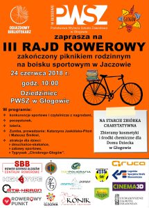 – Tegoroczna trasa rajdu rozpocznie się na dziedzińcu PWSZ o godz. 10 i poprowadzi przez Nielubię do Jaczowa, gdzie na boisku sportowym na uczestników będą czekać liczne atrakcje: konkursy sportowe i czytelnicze z nagrodami, Zumba, gry i zabawy dla dzieci, dmuchańce-skakańce oraz Tygrysek Chrobrego Głogów – informuje Anna Włodarczyk, rzecznik PWSZ w Głogowie.
