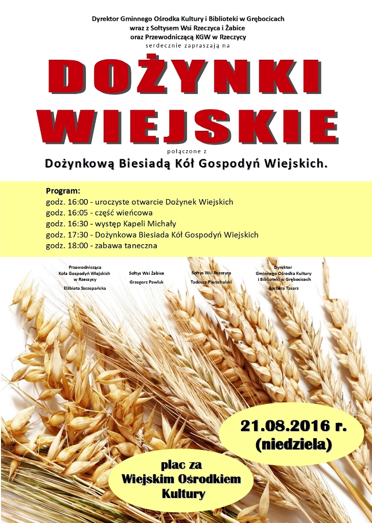 Podwójne świętowanie czeka mieszkańców gminy Grębocice w niedzielę 21 sierpnia 2016 roku w Rzeczycy. Dożynki wiejskie w tym roku połączono z dożynkową biesiadą kół gospodyń wiejskich. Uroczystość odbędzie się na terenach zielonych za Wiejskim Ośrodkiem Kultury.