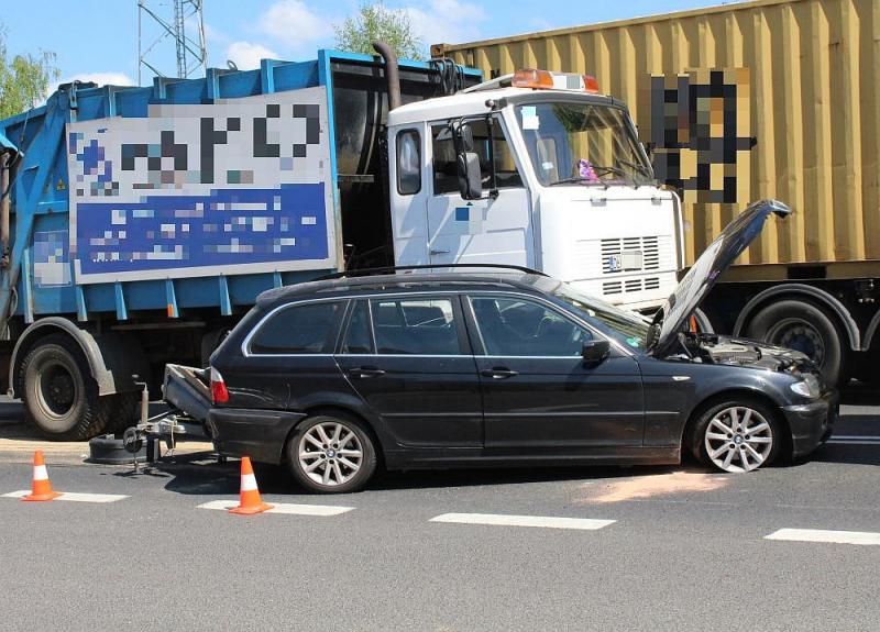 Kierowca BMW trafił do szpitala. Osobom, które jechały śmieciarką, nic się nie stało.