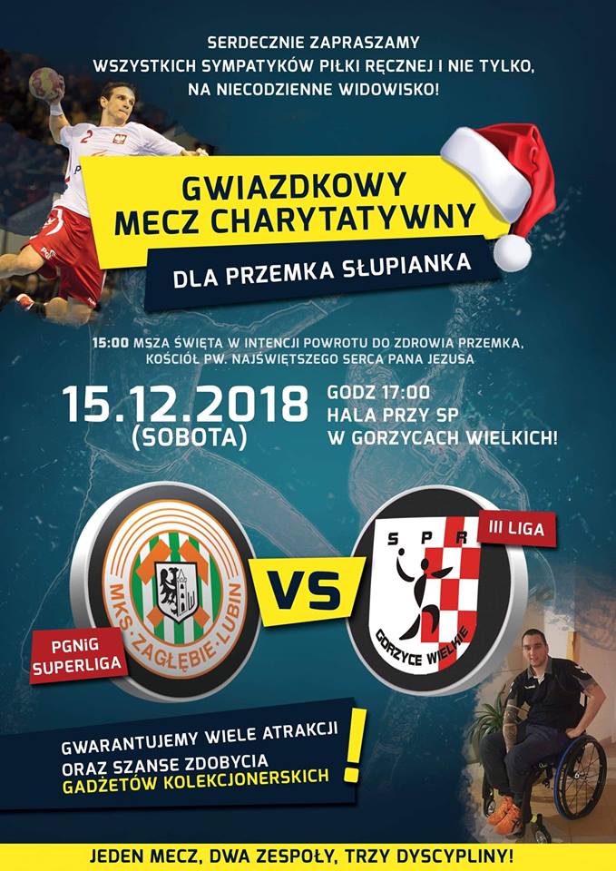Jeden mecz, dwa zespoły, trzy dyscypliny – piłkarze ręczni Zagłębia Lubin zagrają Gwiazdkowy Mecz Charytatywny z SPR Szczypiorniak Gorzyce Wielkie. Fundusze zebrane podczas spotkania zostaną przeznaczone dla Przemka Słupianka. Były szczypiornista KPR Ostrovia Ostrów Wielkopolski jest sparaliżowany i potrzebuje środków na dalszą rehabilitację.