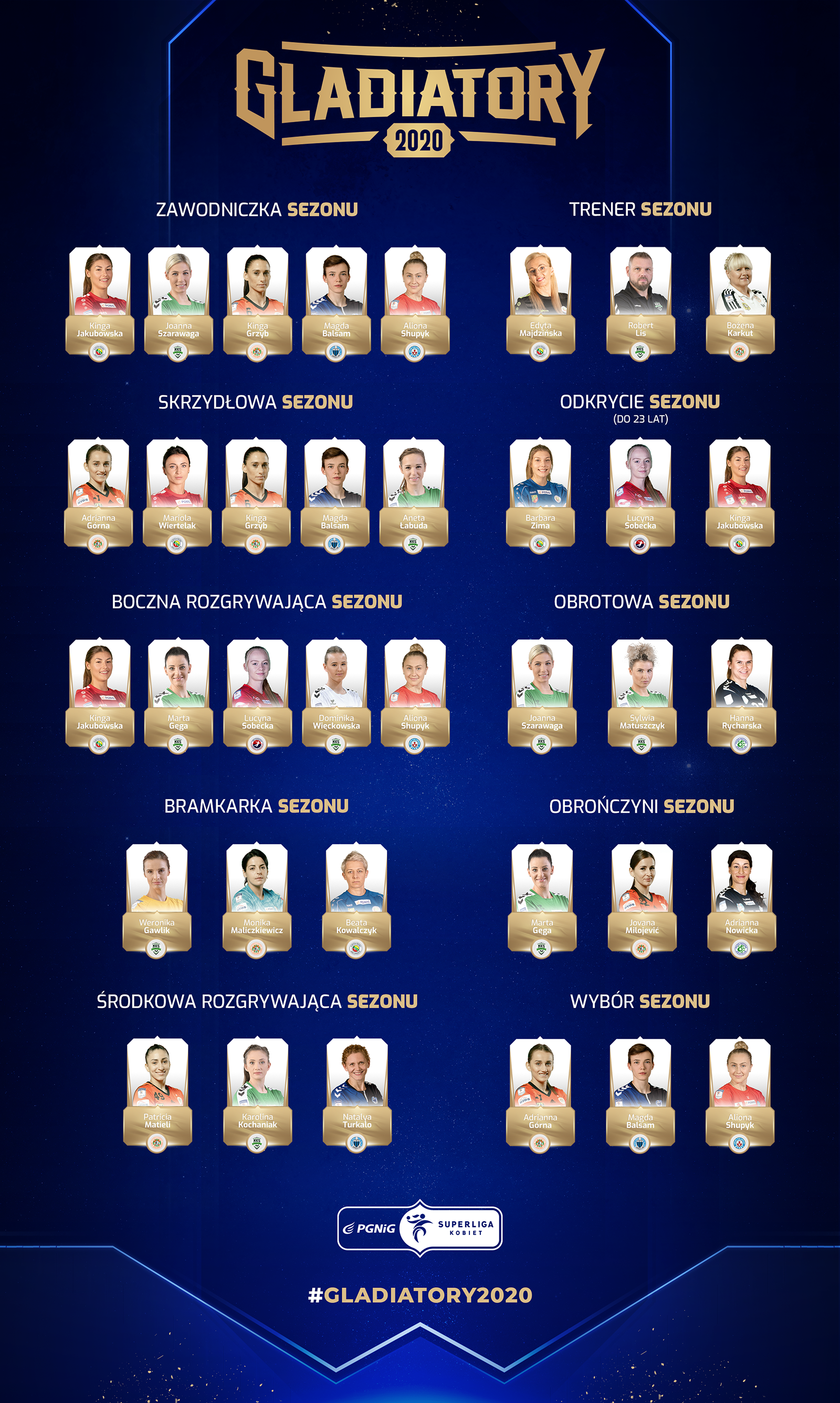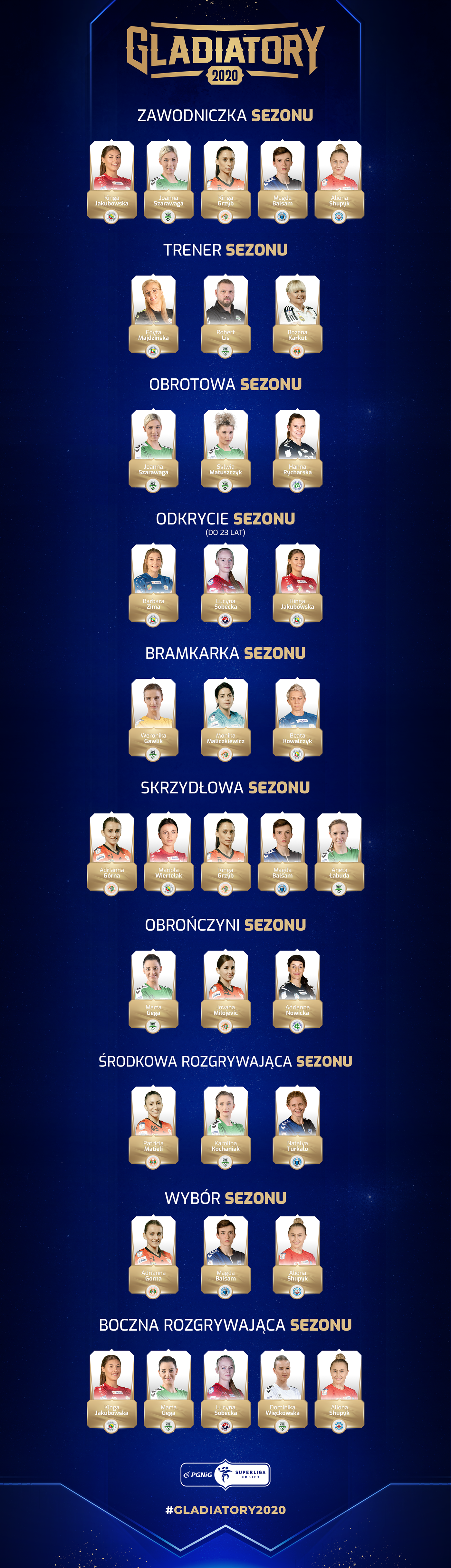 Po raz pierwszy Kapituła PGNiG Superligi Kobiet nominowała najlepsze zawodniczki i najlepszych trenerów do tytułu Gladiatorów 2020. Co prawda sezon 2019/2020 jest już zakończony, ale emocje związane z rozdaniem najbardziej prestiżowych indywidualnych nagród w polskiej piłce ręcznej kobiet wciąż przed nami. Wśród nominowanych jest kilka zawodniczek Metraco Zagłębia Lubin i trener Miedziowych.