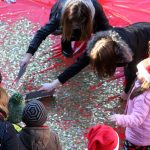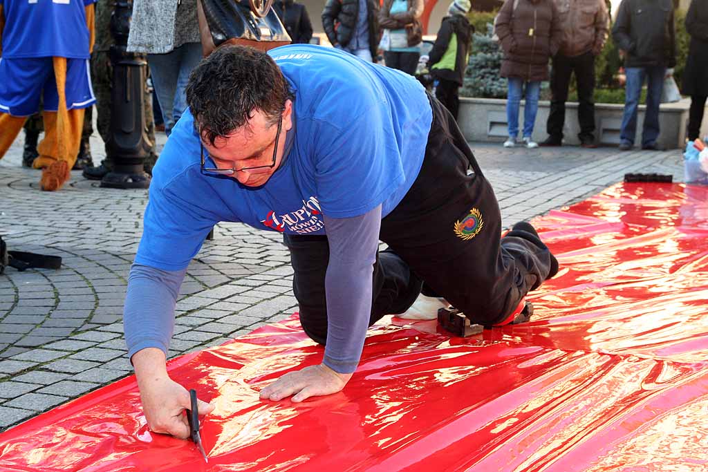 Do wykonania szablonu serca wykorzystano materiał o wymiarach 10 x 7,60m. Jaworzanie wysypują na nim monety, które zostaną policzone oraz zważone. Następnie zostanie obliczona długość tych monet.