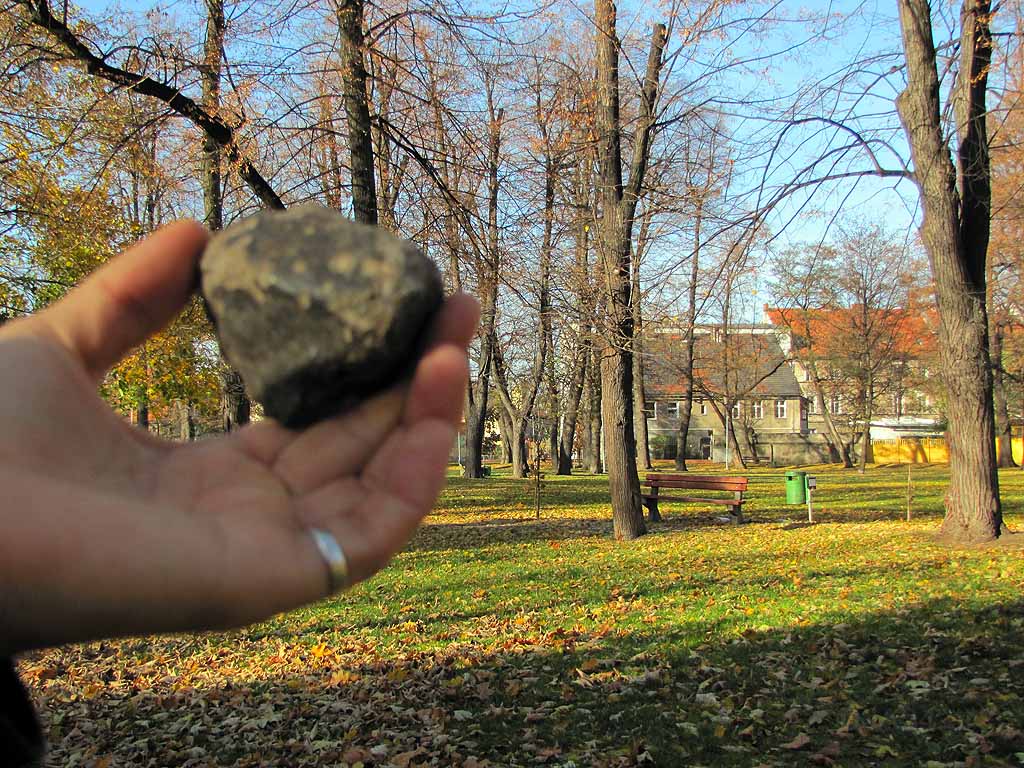 IMG_0014Niezwykły błysk na niebie, bolid na niebie, który zaobserwowała cała Polska, jako miejsce lądowania wybrał sobie Jawor? Świadkowie zdarzenia widzieli i słyszeli błyszczący świst nad Parkiem Pokoju. Po kilkunastu minutach poszukiwań odnaleźli, jak twierdzą, meteoryt.