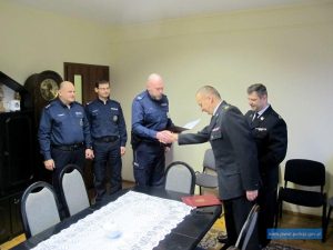 Strażacy na czele z komendantem mł. bryg. Waldemarem Sarlejem i jego zastępcą mł. bryg. Arkadiuszem Delikatnym wręczyli policjantom listy gratulacyjne, doceniając ich wielką odwagę i poświęcenie.