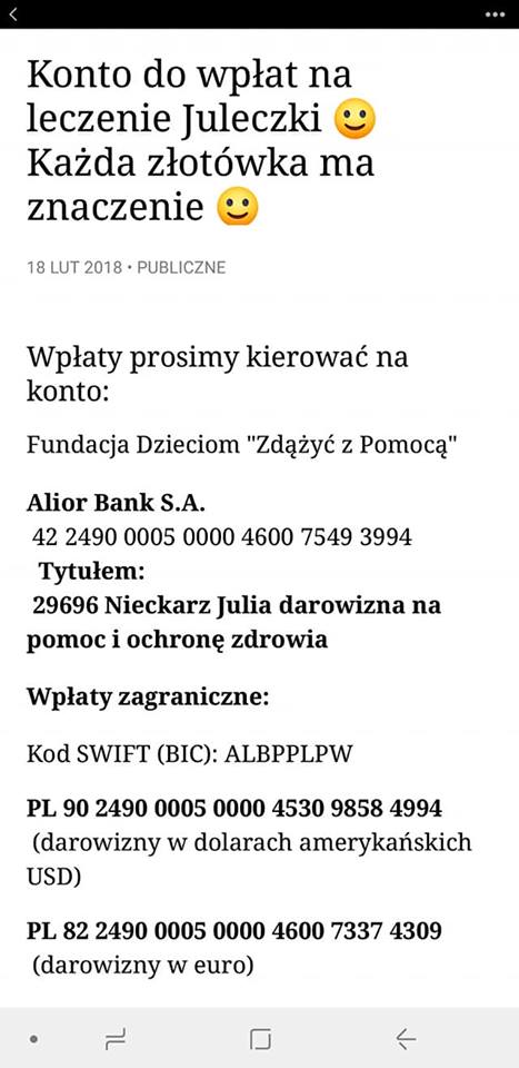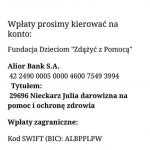 Udało się! Cała trójka – mama, tato i oczywiście Julcia Nieckarzowie z Lubina otrzymali wizy do Stanów Zjednoczonych. – Nie było łatwo, maglowali nas długo, ale udało się! Mamy pozwolenie, więc lecimy z Julcią na operację. To już pewne – cieszy się Paulina Nieckarz, mama dziewczynki, przy okazji dziękując wszystkim darczyńcom. Podkreśla jednak, że to nie koniec walki – dziewczynka będzie przechodzić operacje i korekty kości nóg do 18. roku życia… Państwo Nieckarz wciąż zbierają pieniądze na leczenie i rehabilitację dziecka.
