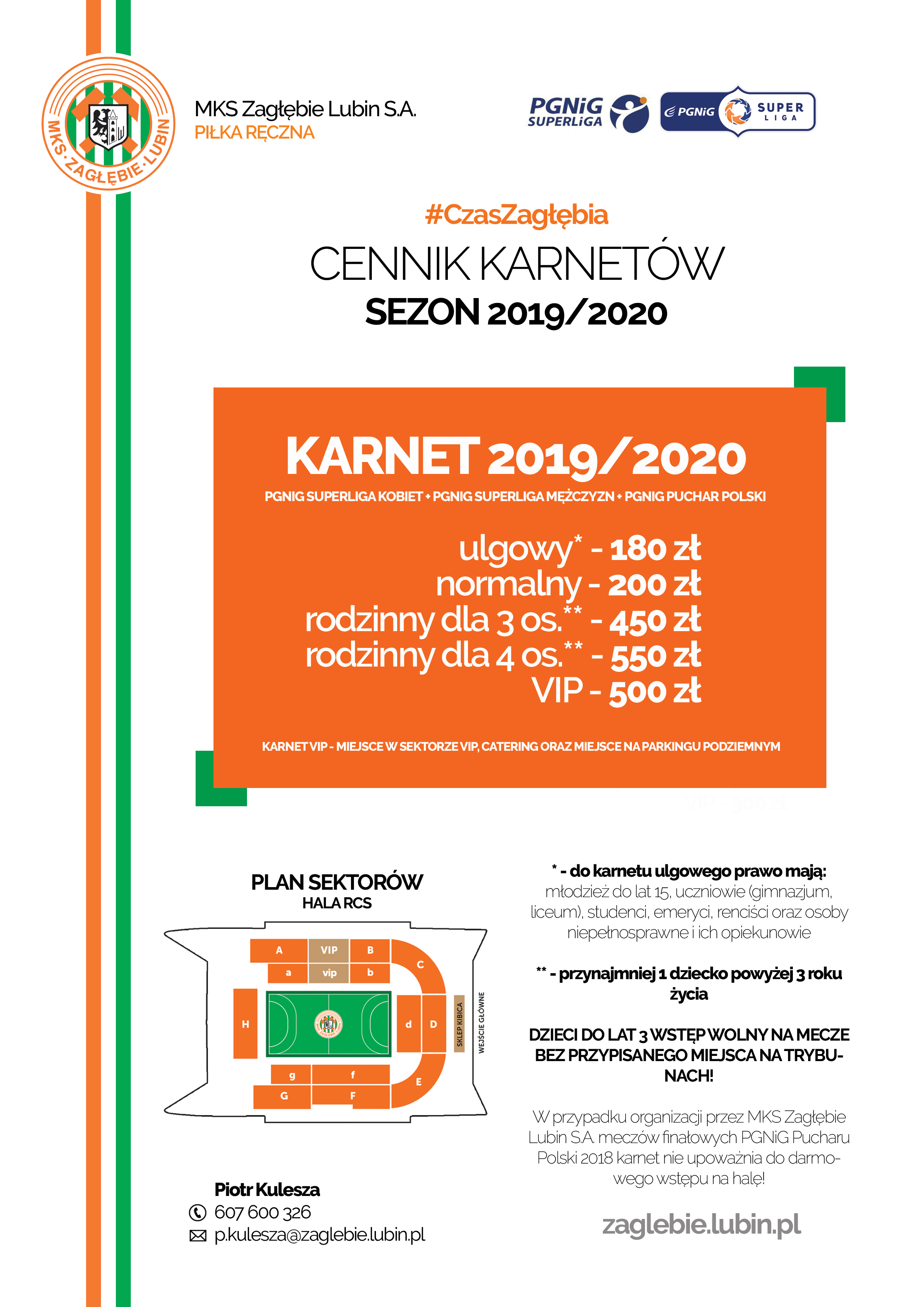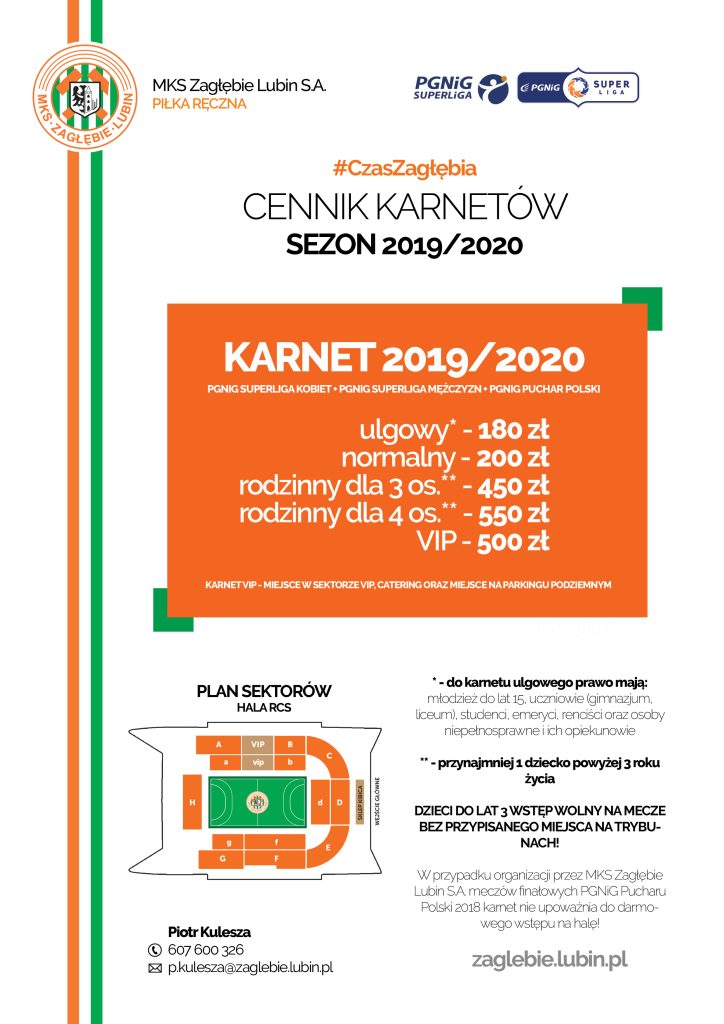 W sezonie 2019/20 nie będzie możliwości zakupu karnetu na jedną z sekcji MKS Zagłębia Lubin SA. Karnet 2019/20 obowiązuje na wszystkie mecze PGNIG Superligi Kobiet, PGNIG Superligi Mężczyzn, PGNIG Pucharu Polski oraz Pucharu EHF Kobiet.
