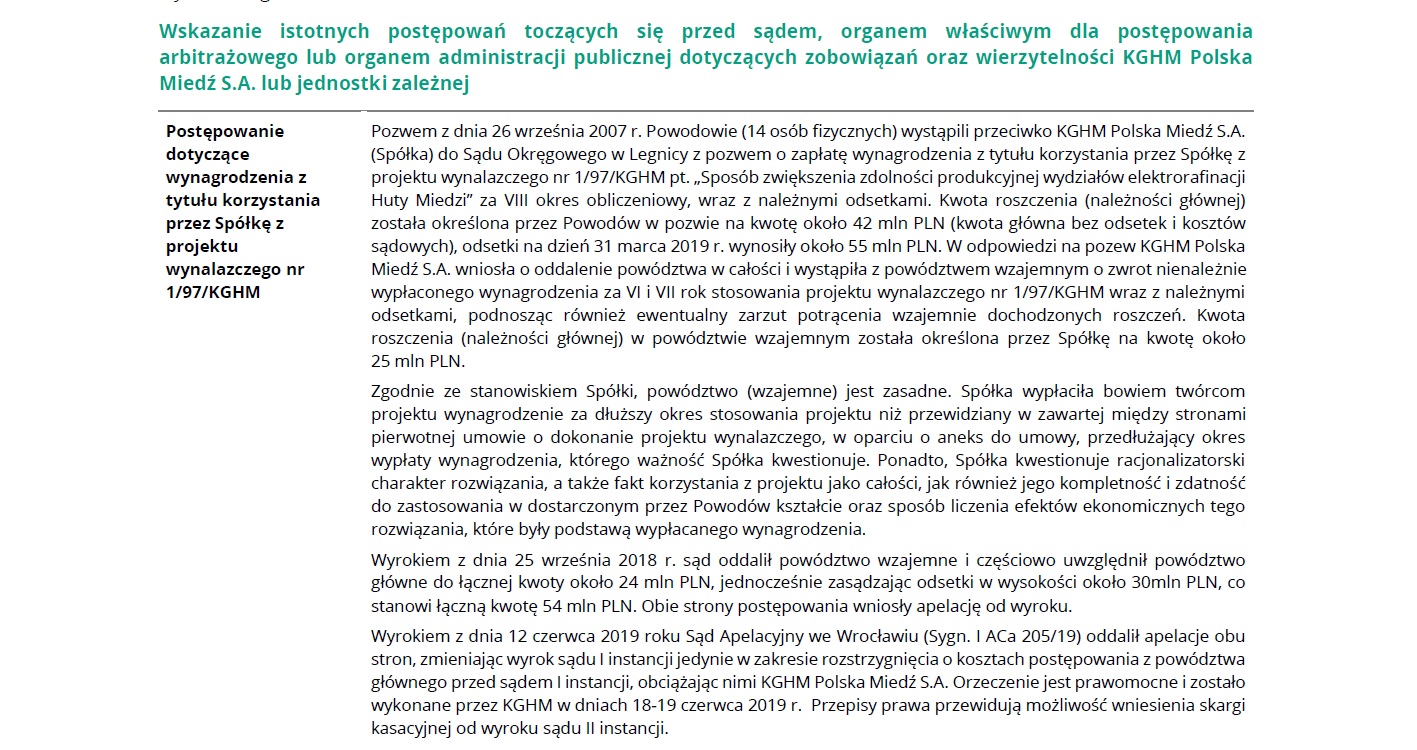 W pewnym momencie KGHM wstrzymał wypłaty. W 2007 roku 14 racjonalizatorów podało spółkę do sądu, domagając się 42 mln zł plus odsetki. KGHM zaś zażądał zwrotu ponad 25 mln zł. Sąd Okręgowy w Legnicy połączył obie sprawy i po wielu latach, we wrześniu 2018 wydał wyrok. Oddalił powództwo miedziowego giganta i częściowo uznał roszczenia racjonalizatorów. Obie strony złożyły apelacje, które – jak dziś już wiemy – sąd oddalił.