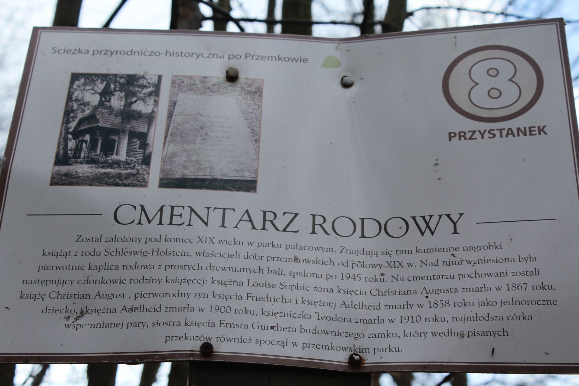 Spoczywają tu: księżna Louise Sophie, żona księcia Christiana Augusta, zmarła w 1867 r., książę Christian August, pierworodny syn księcia Friedricha i księżnej Adelheid, zmarły w 1858 r., jako jednoroczne dziecko, księżna Adelheid zmarła w 1900 r., księżniczka Teodora zmarła w 1910 r., najmłodsza córka wspomnianej pary. Według pisanych przekazów w przemkowskim parku spoczął też książę Ernst Günther, budowniczy zamku.
